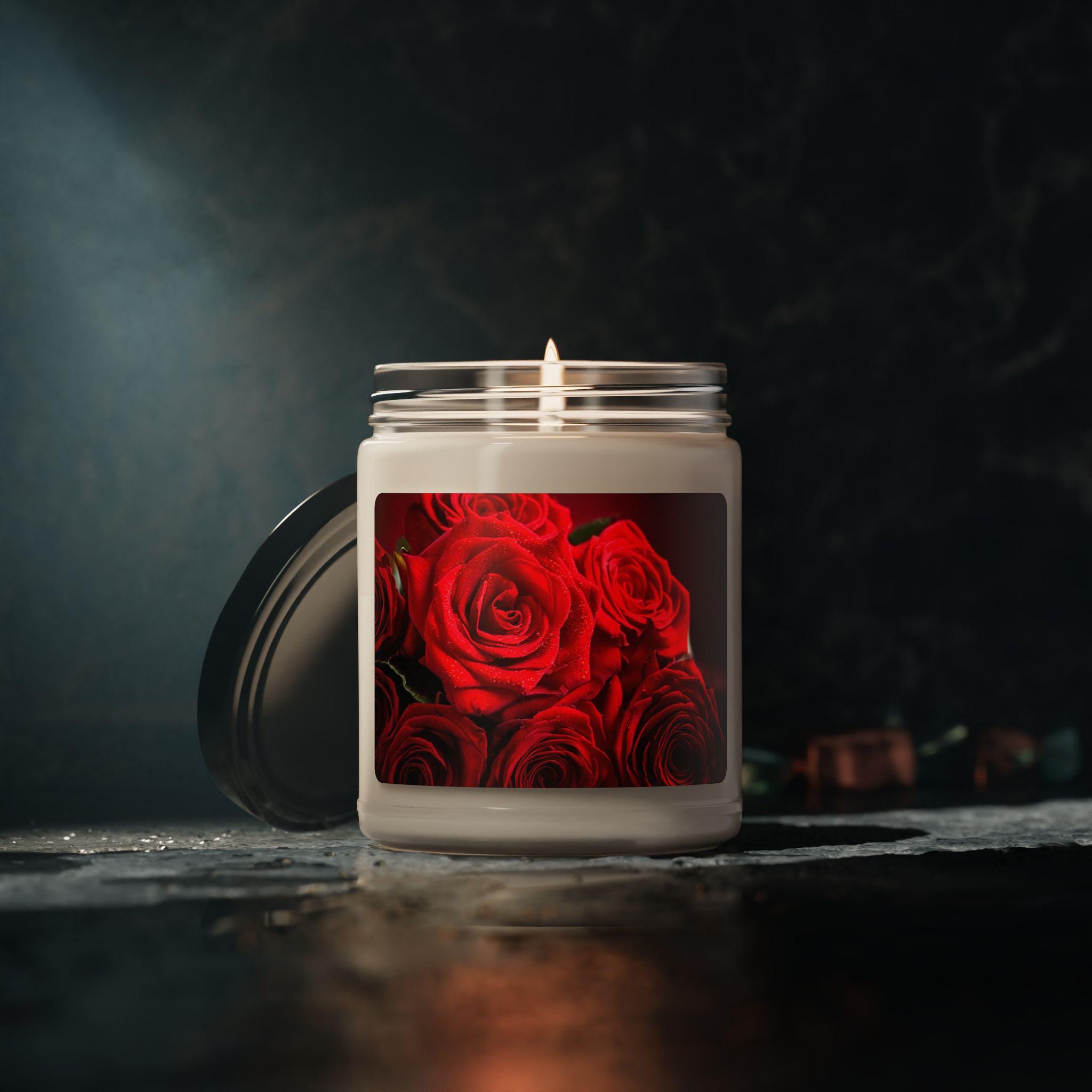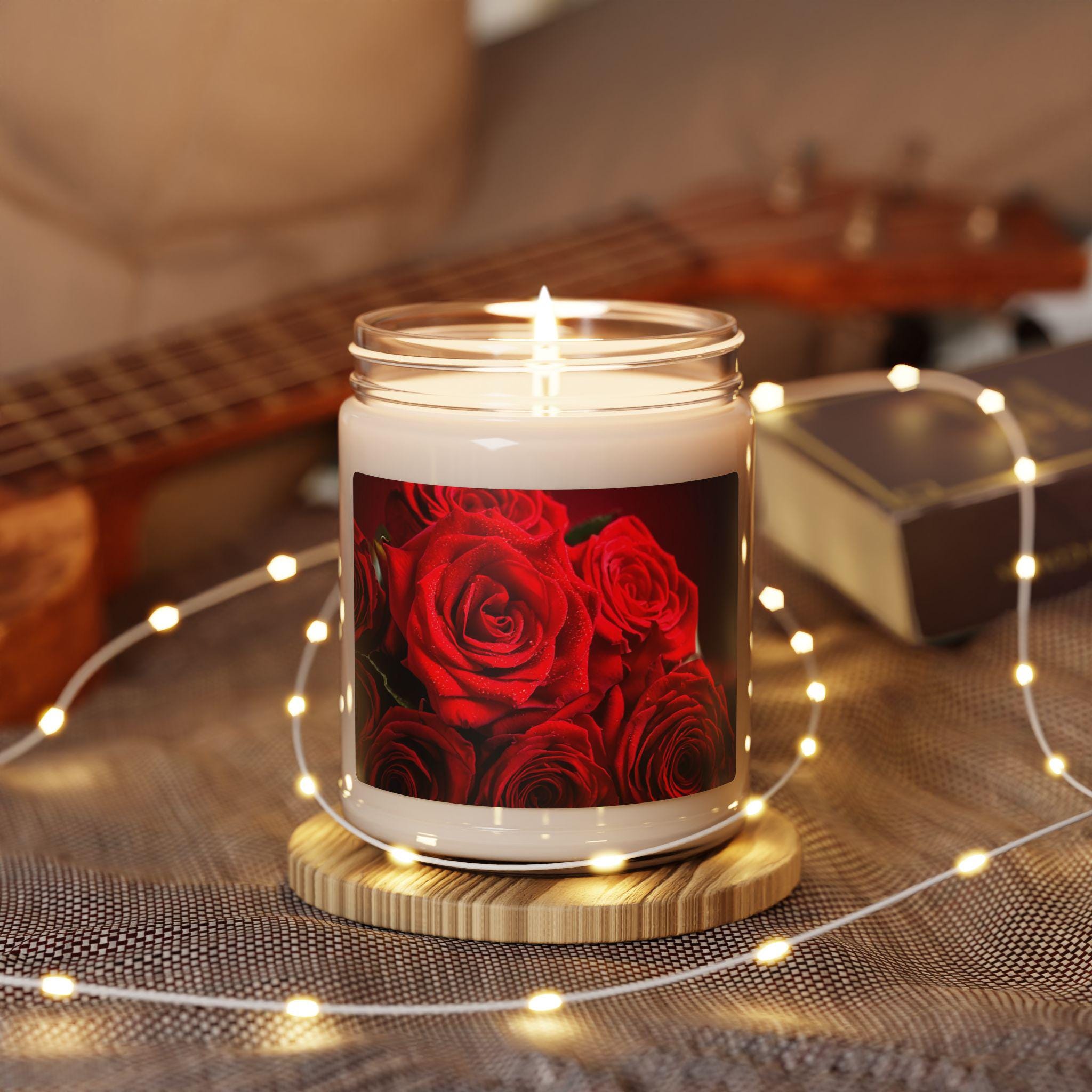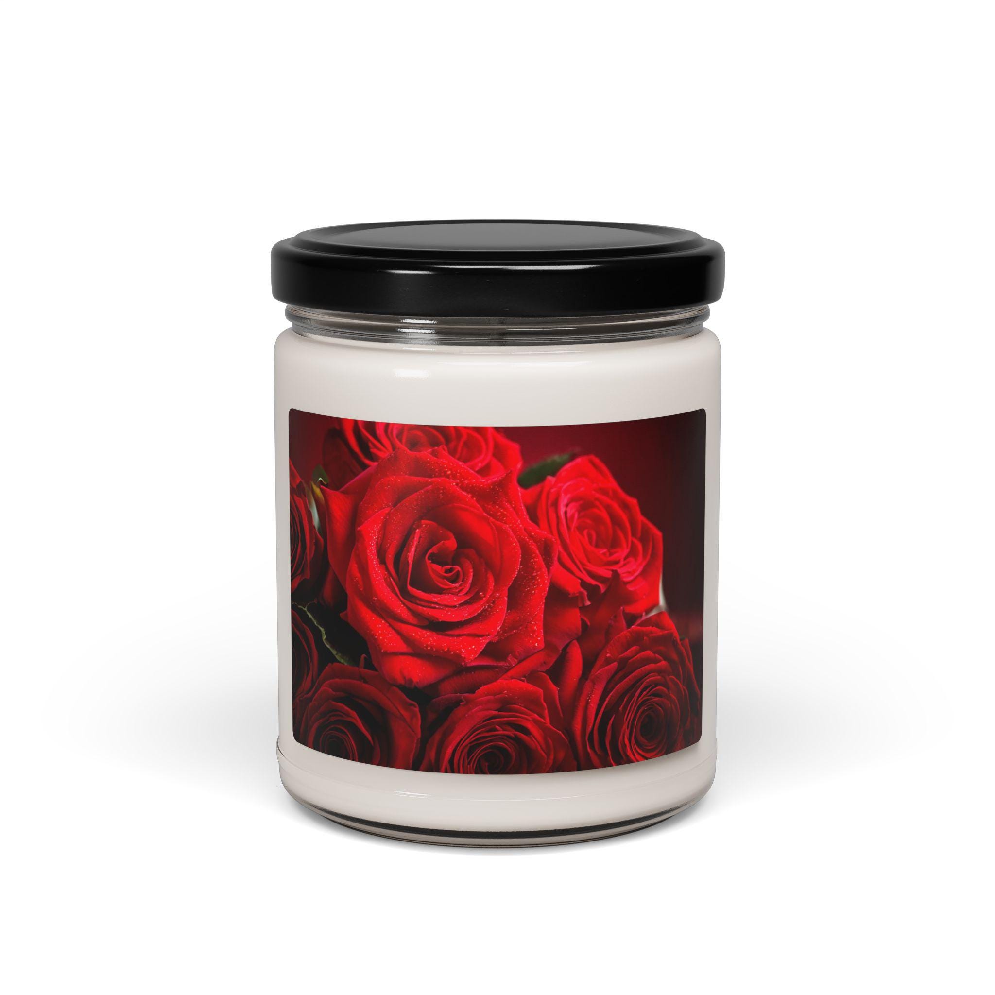Eco-friendly scented soy candle featuring a Red Rose image. Perfect for creating a relaxing atmosphere in your home or as a thoughtful gift for her. Ideal for spring and birthdays.
