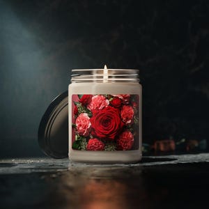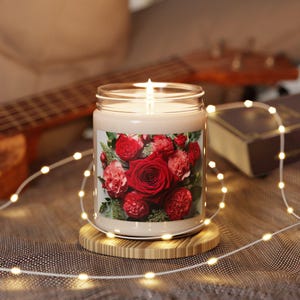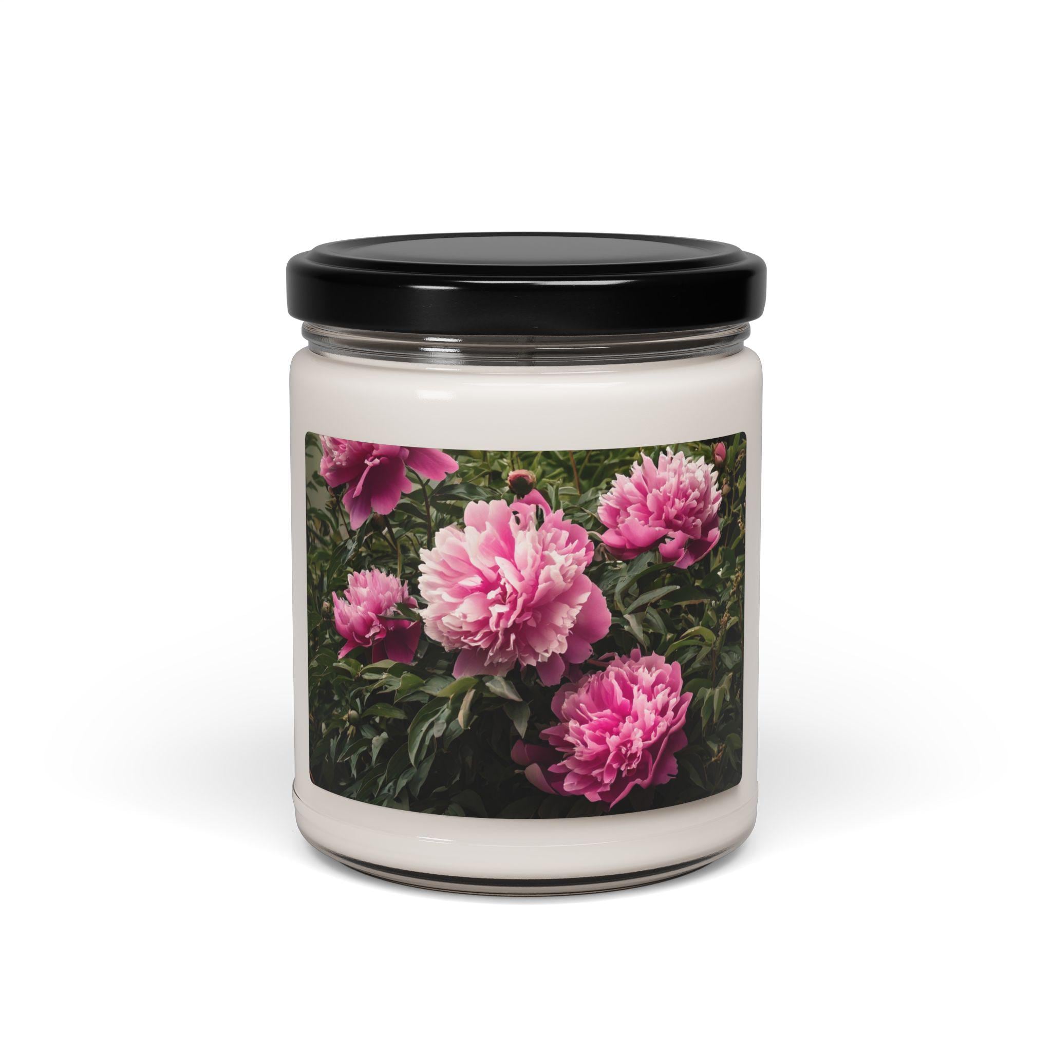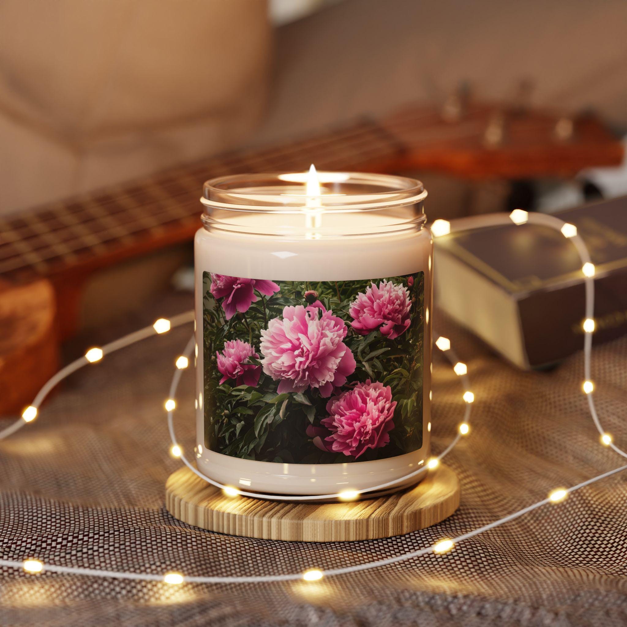 Eco-friendly scented soy candle featuring a peony image, perfect for creating a relaxing home ambiance. Ideal as a gift for her, this candle provides eco-friendly aromatherapy with a spring candle vibe, making it a great birthday gift or home decor item.