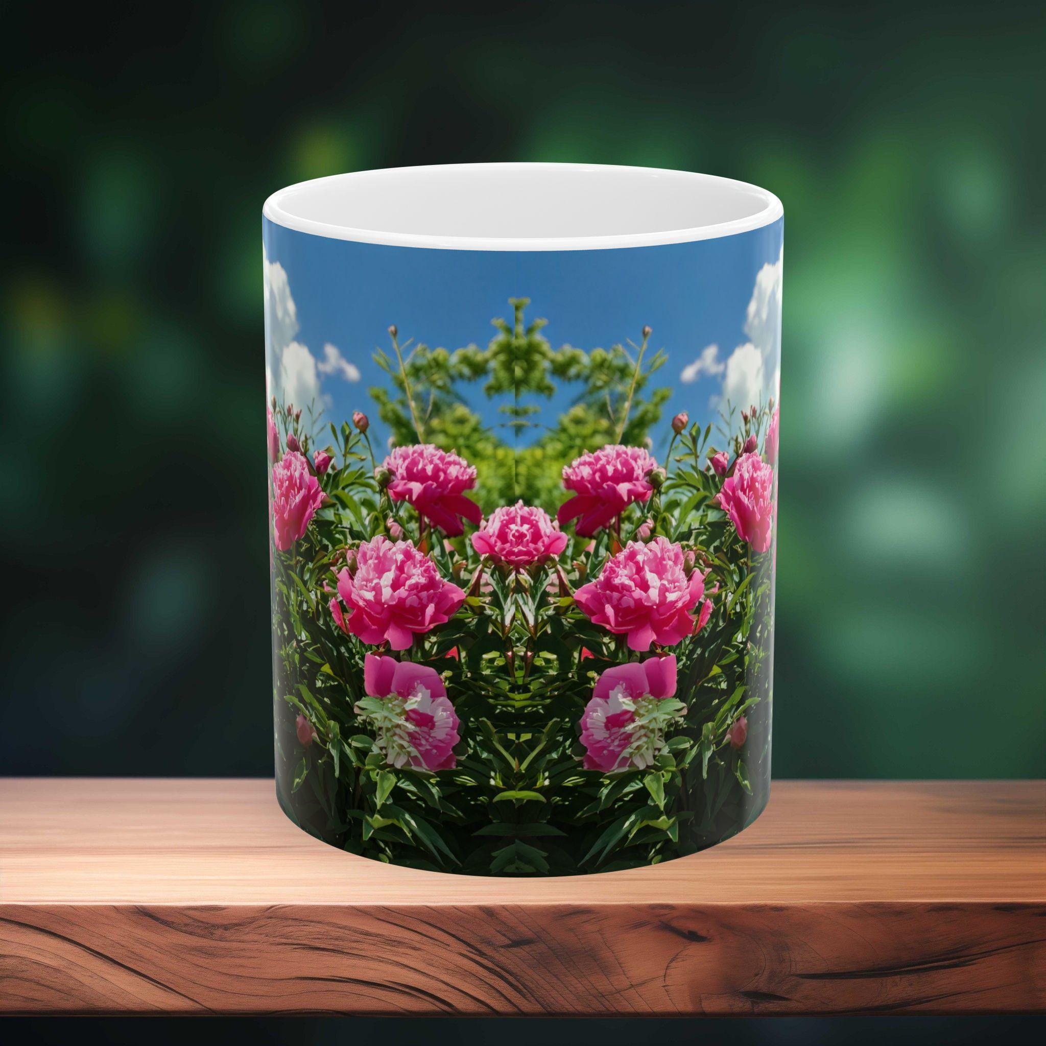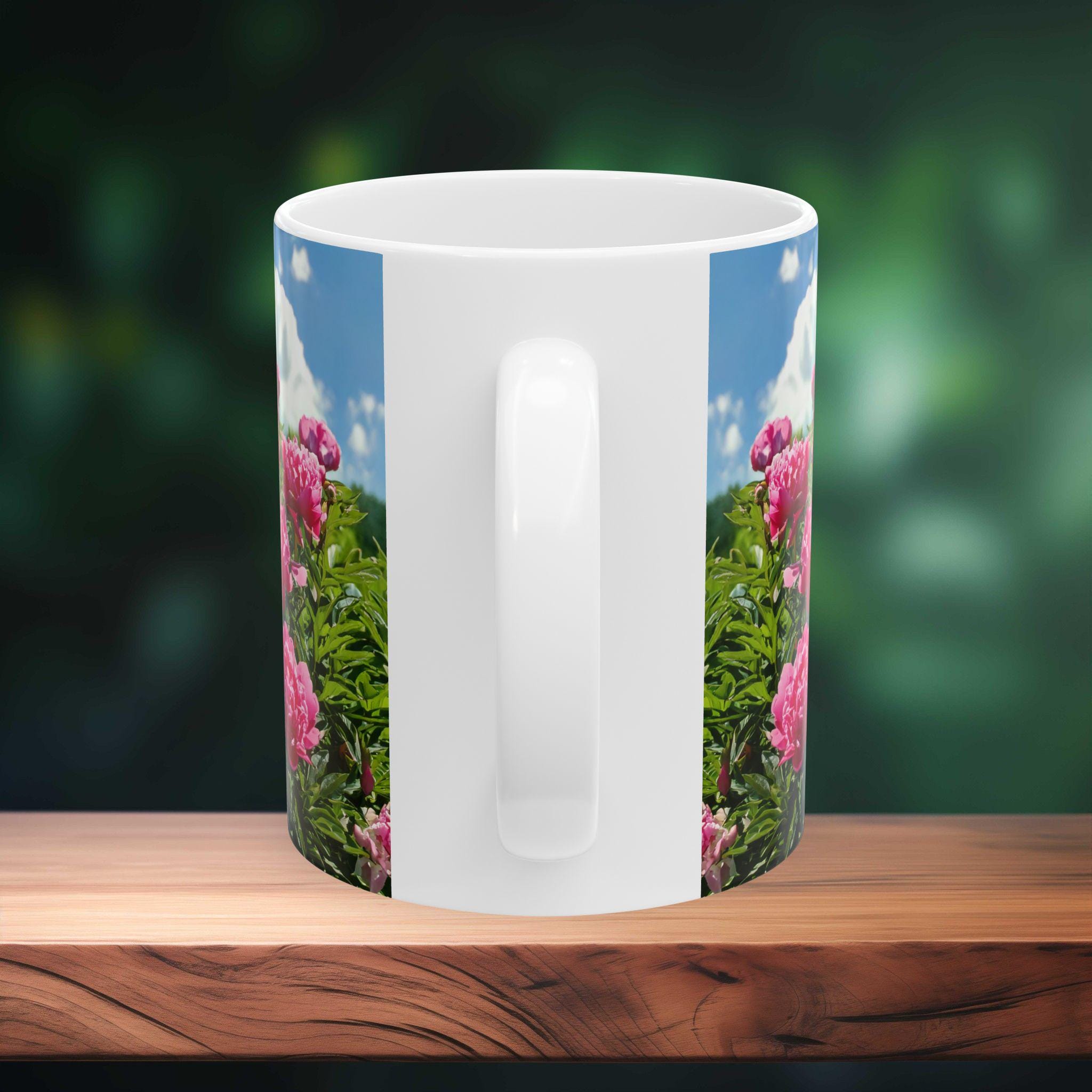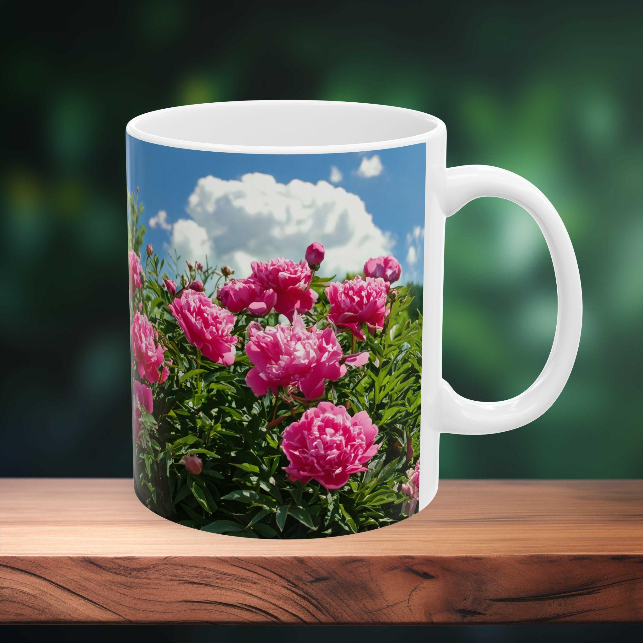 A ceramic mug featuring a design of a vibrant Peonies on a sunny day. The perfect accessory for enjoying a hot beverage in the morning or afternoon, this mug provides a calming and peaceful vibe to your daily routine. Ideal for nature lovers and those who appreciate beautiful floral designs. Great for birthdays, Mother's Day, or any occasion to show appreciation.
