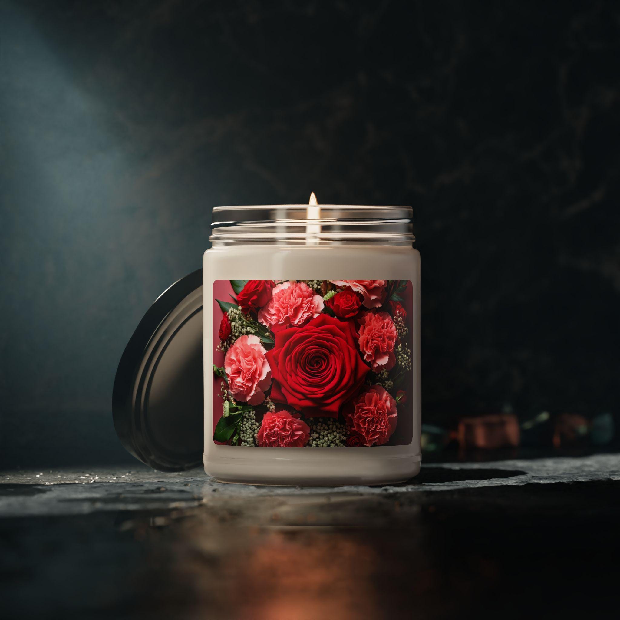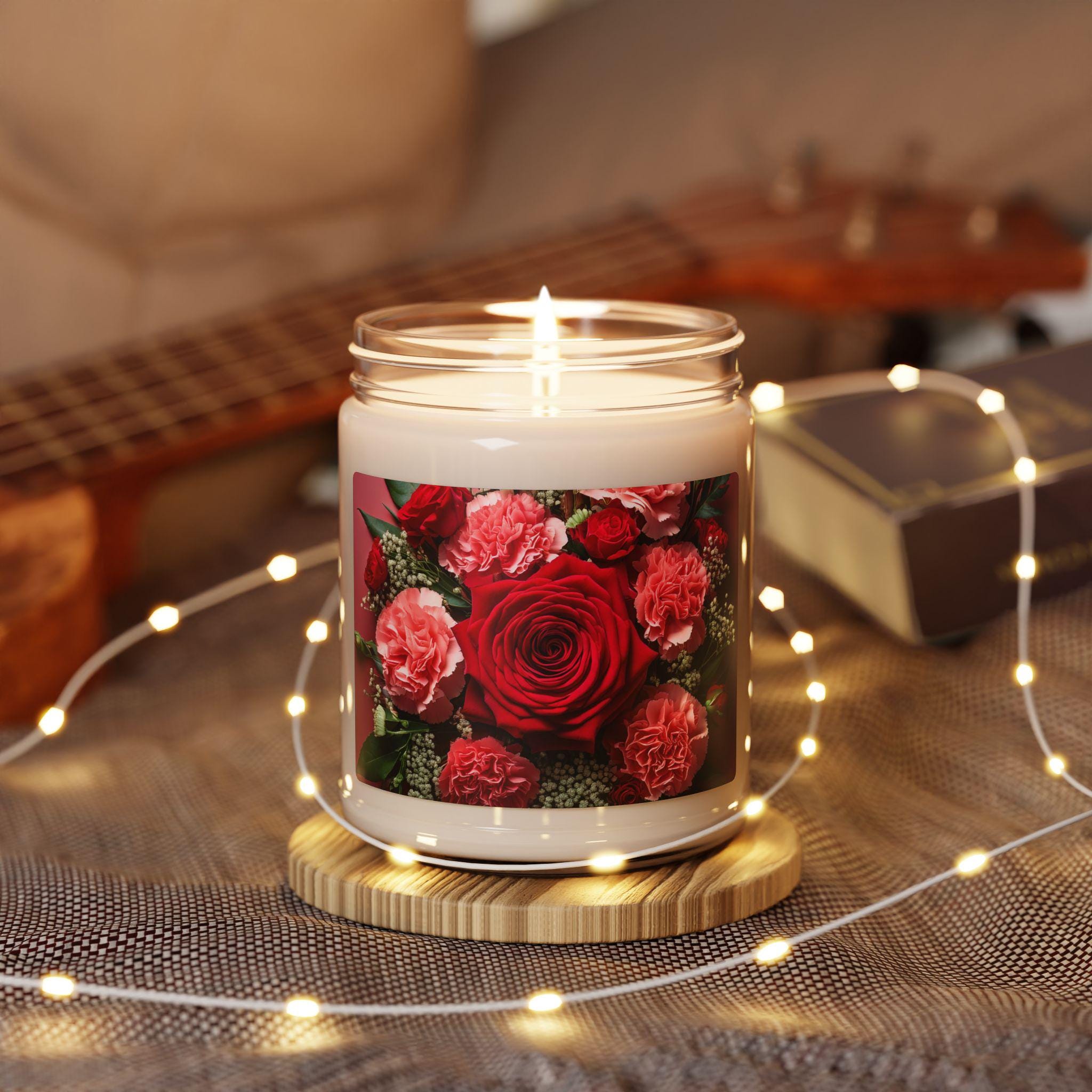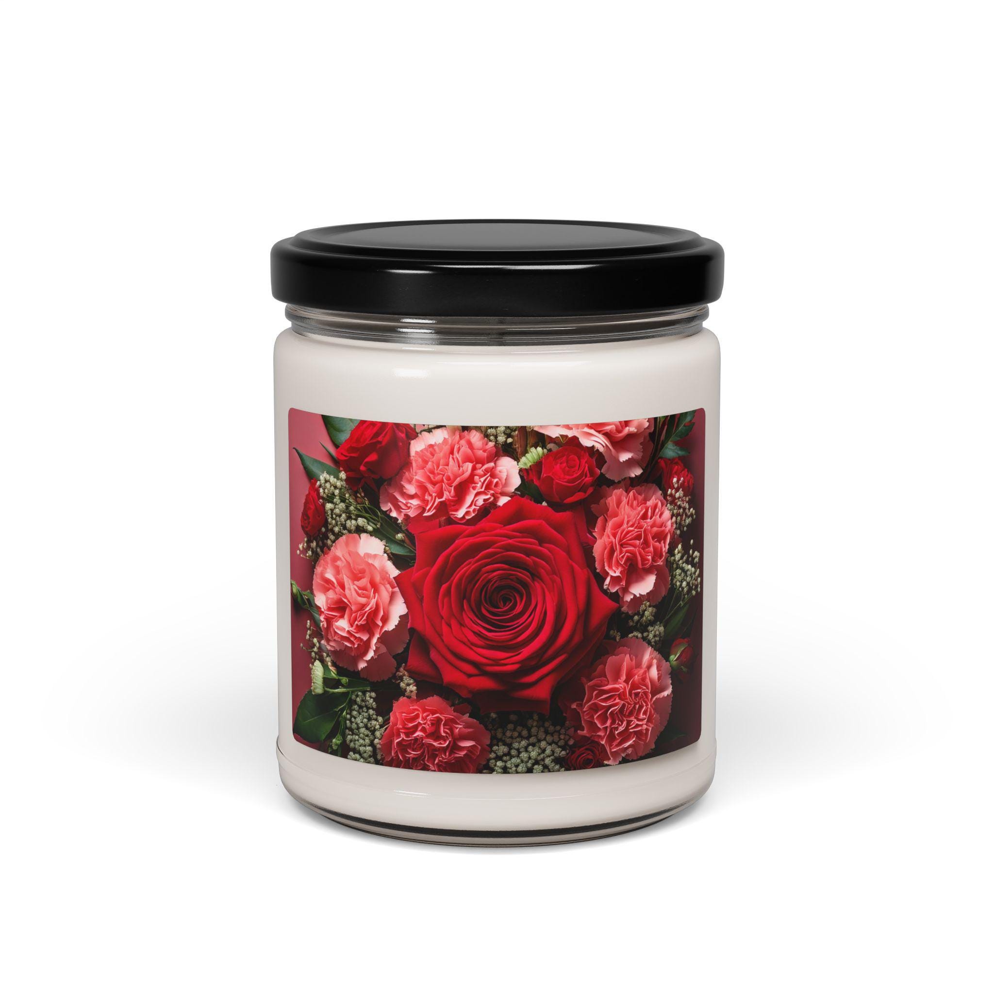 Eco-friendly scented soy candle featuring a Red Rose Pink Carnation image. Perfect for creating a relaxing atmosphere in your home or as a thoughtful gift for her. Ideal for spring and birthdays.