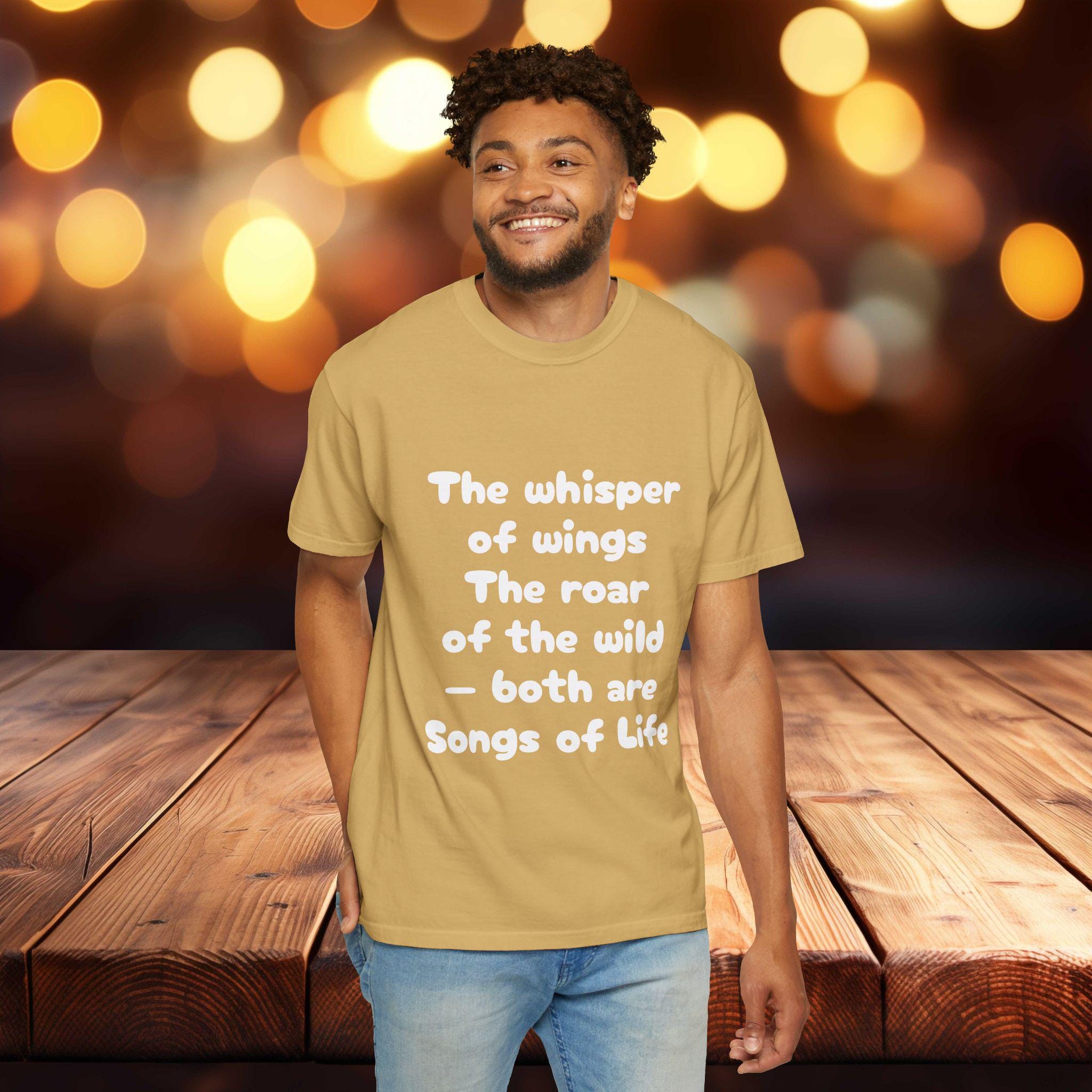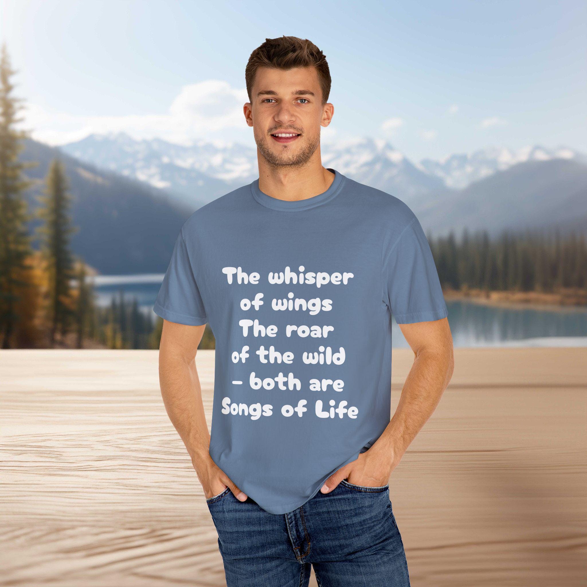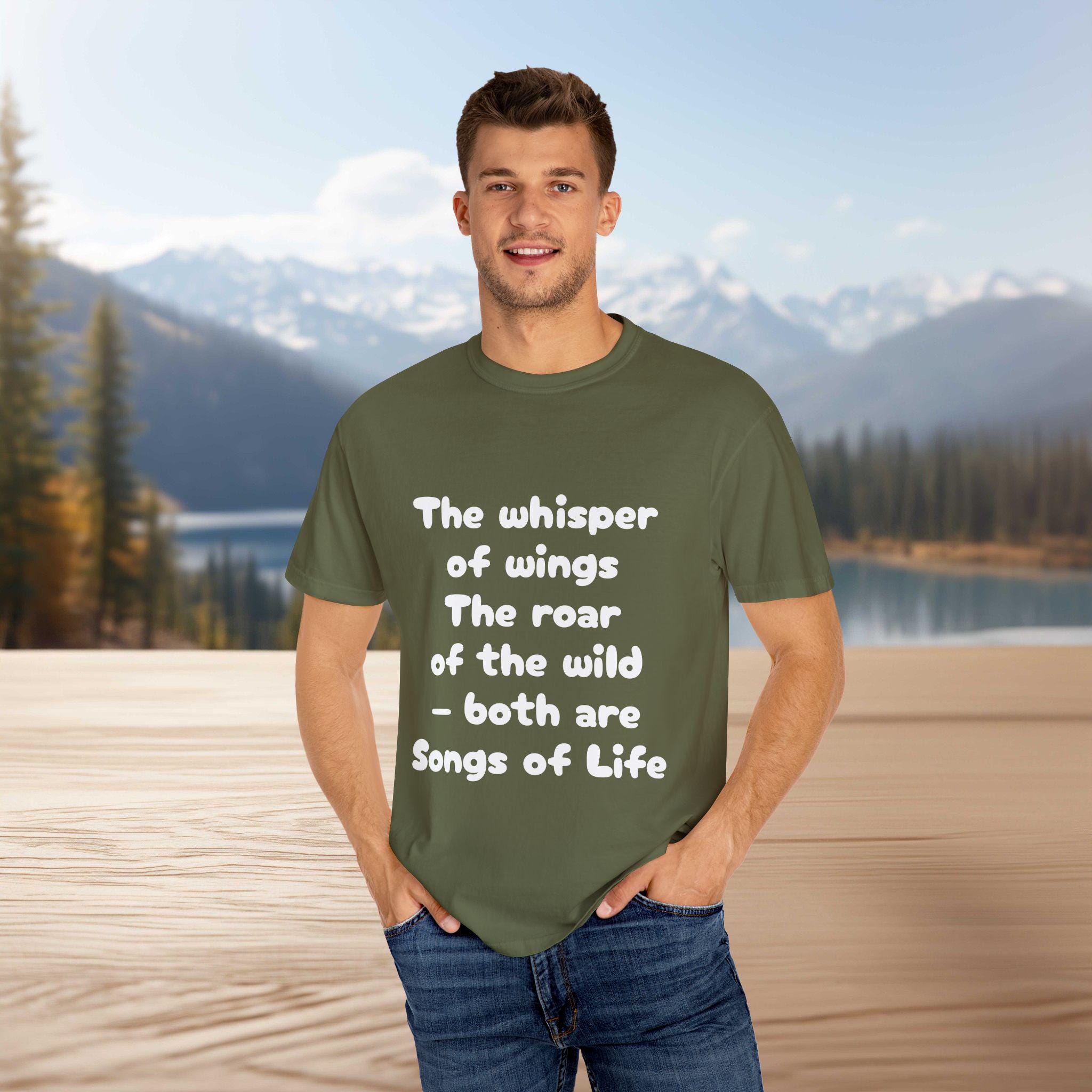 A unisex garment-dyed T-shirt featuring the message 'Protect the wild - it protects us.' This tee gives off a laid-back, outdoorsy vibe and is perfect for nature lovers looking to make a statement. It is relevant for Earth Day, World Wildlife Day, and everyday casual wear.