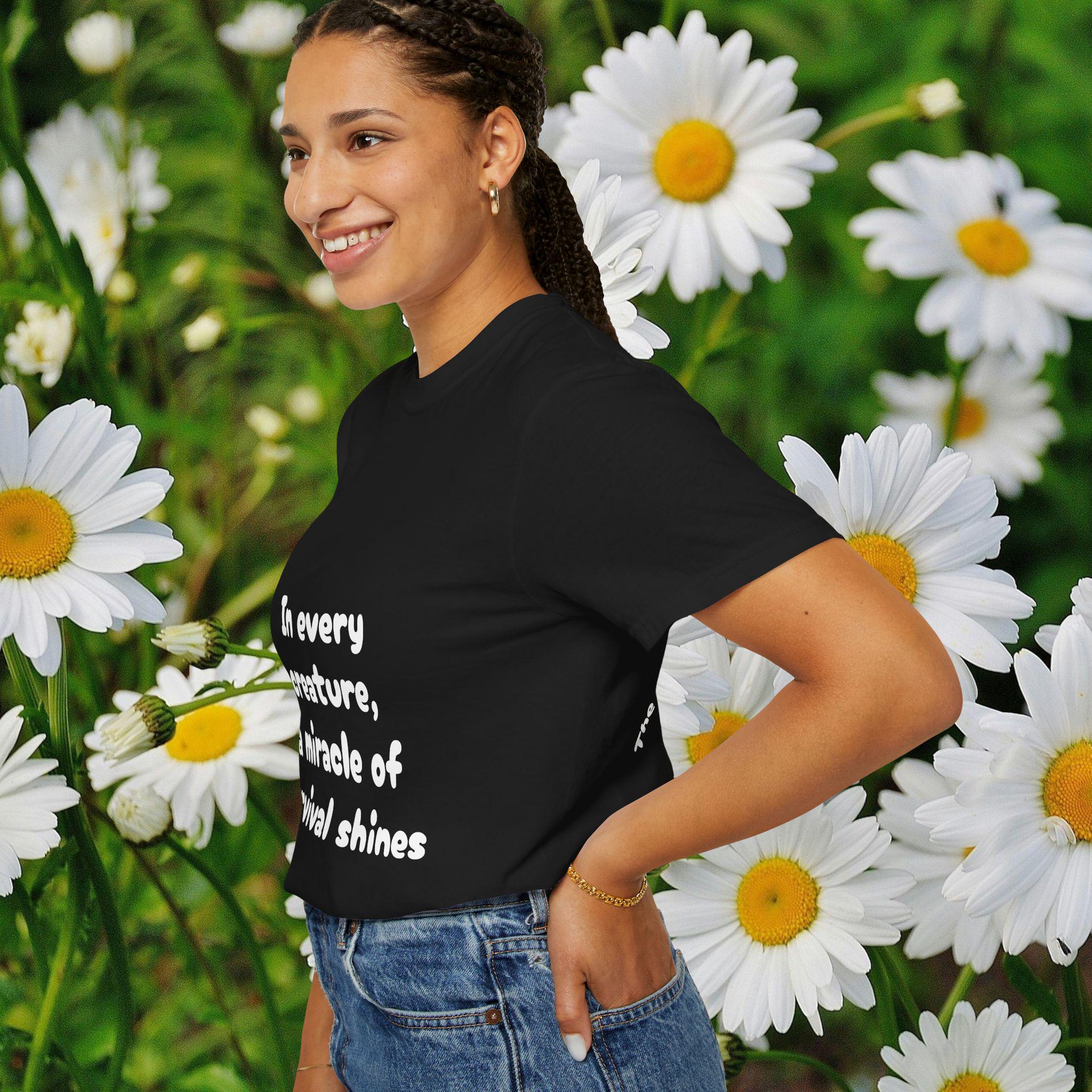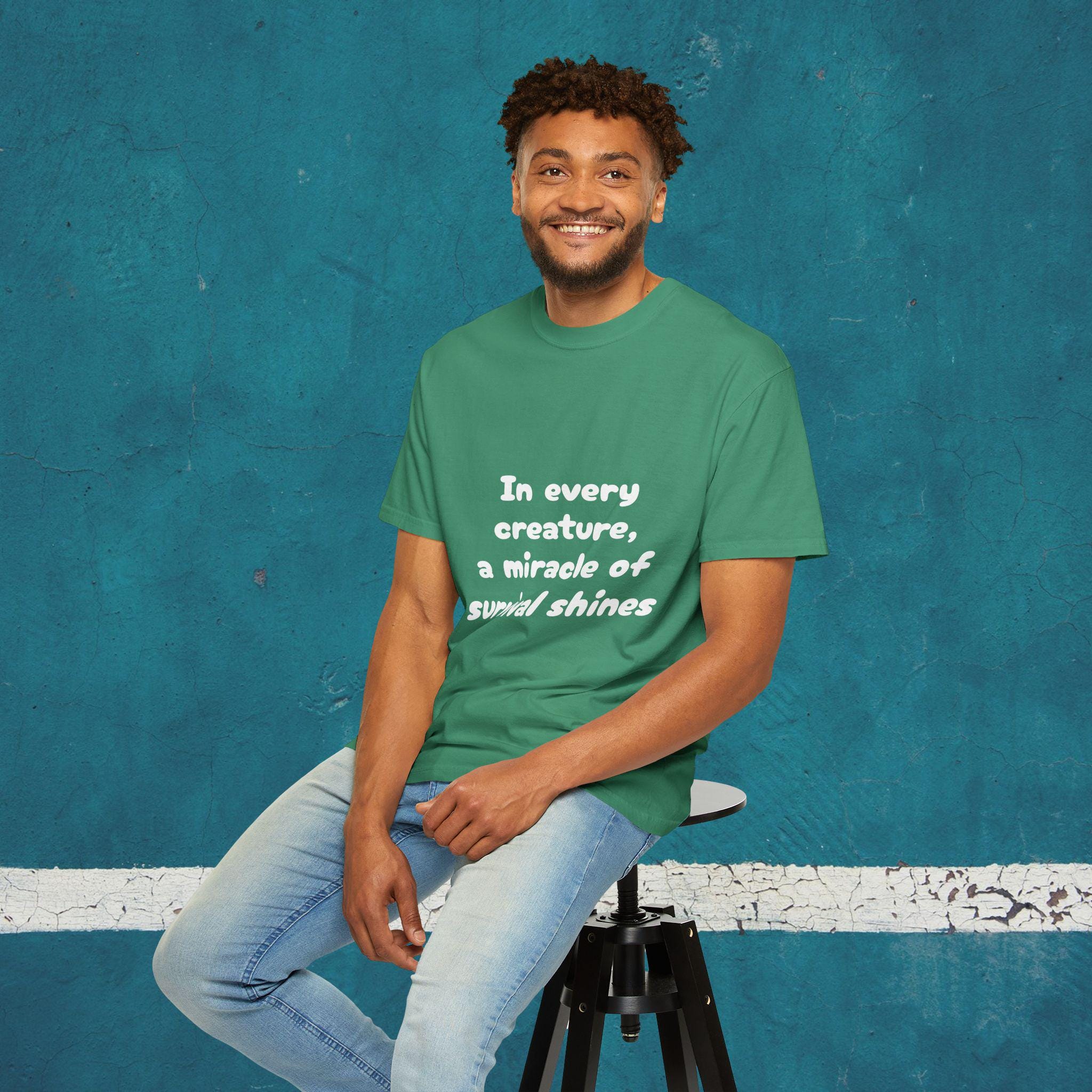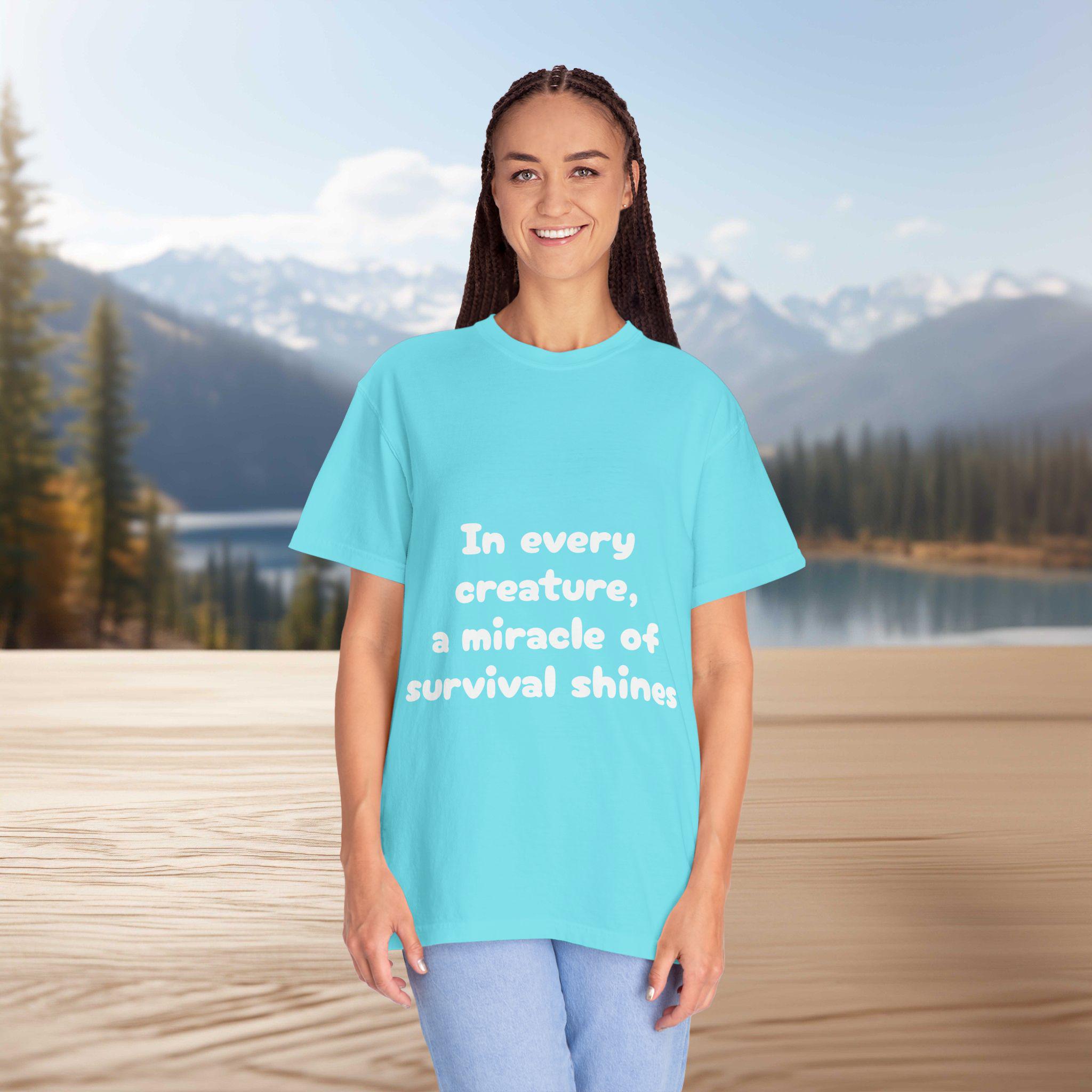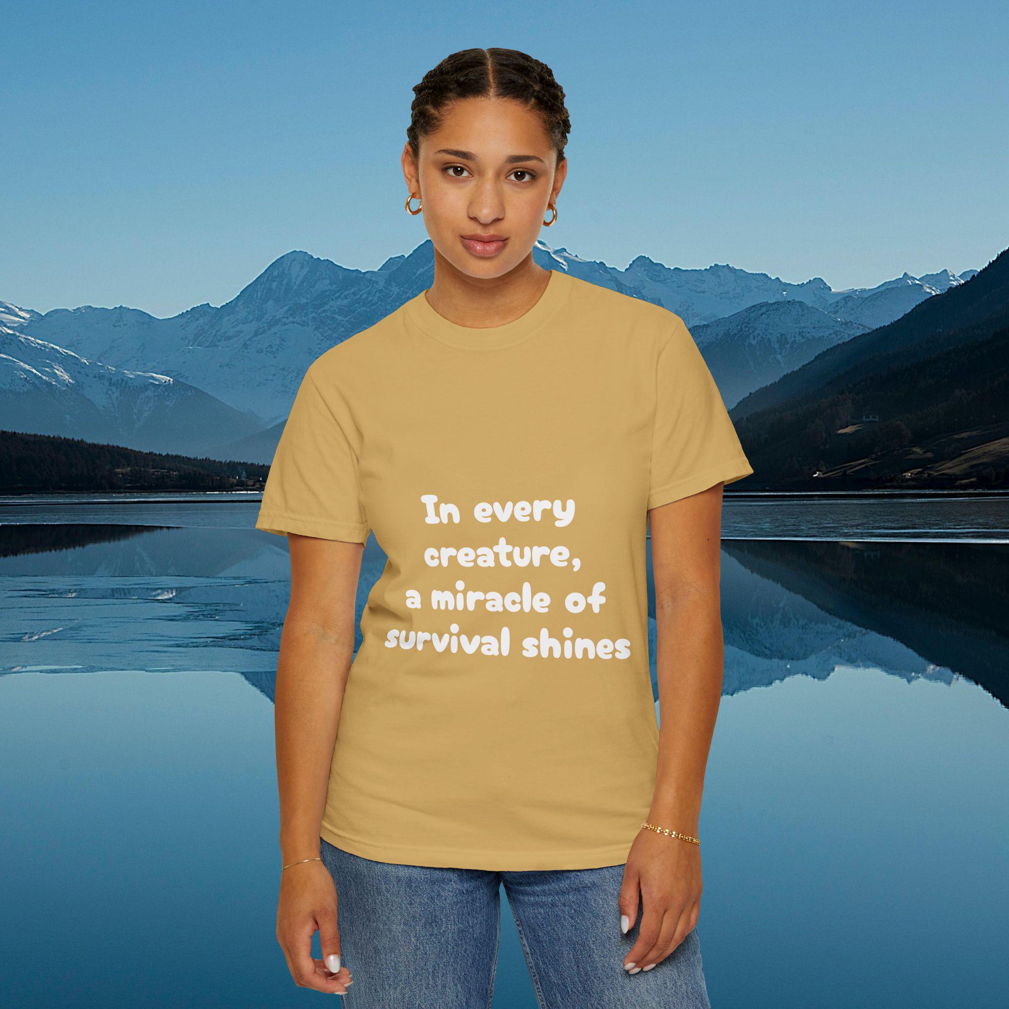 Celebrate the miracle of nature with our inspirational wildlife t-shirt! Featuring the powerful words "In Every Creature, A Miracle of Survival Shines" on the front, this shirt is perfect for nature enthusiasts, wildlife lovers, hikers, campers, and anyone who cherishes the beauty of the natural world.