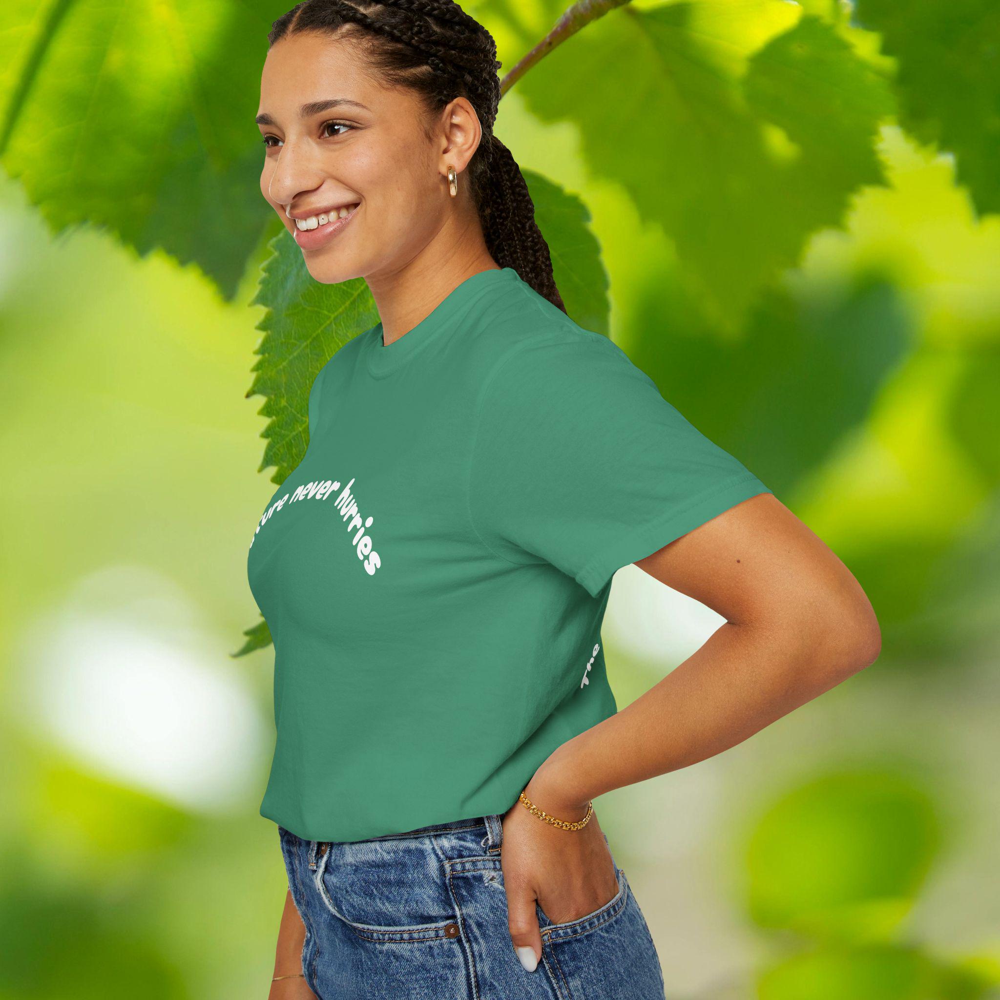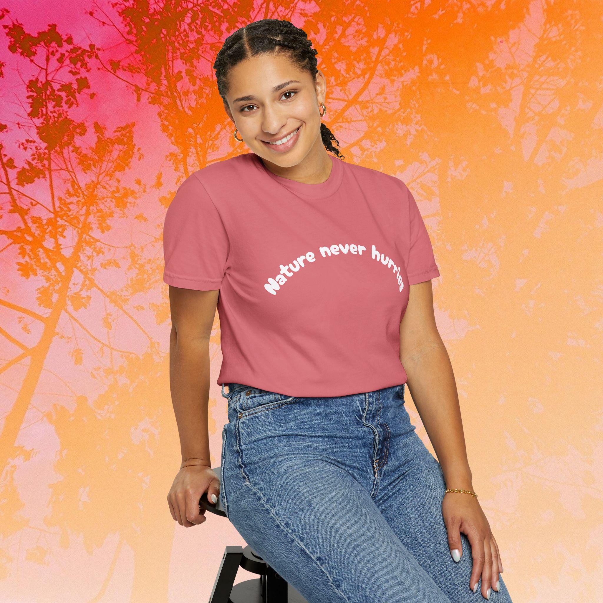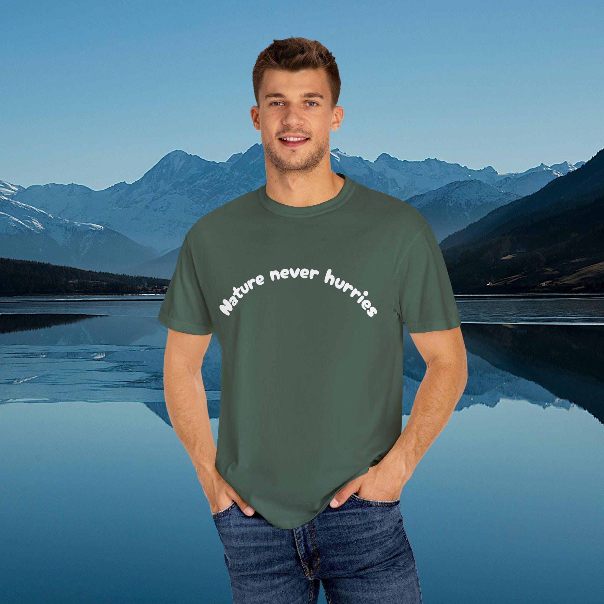 Slow down and embrace the rhythm of the wild with our "Nature Never Hurries" t-shirt. Inspired by the timeless wisdom of nature, this soft and breathable tee is perfect for hikers, outdoor enthusiasts, and anyone who finds peace in the slow and steady beauty of the natural world.