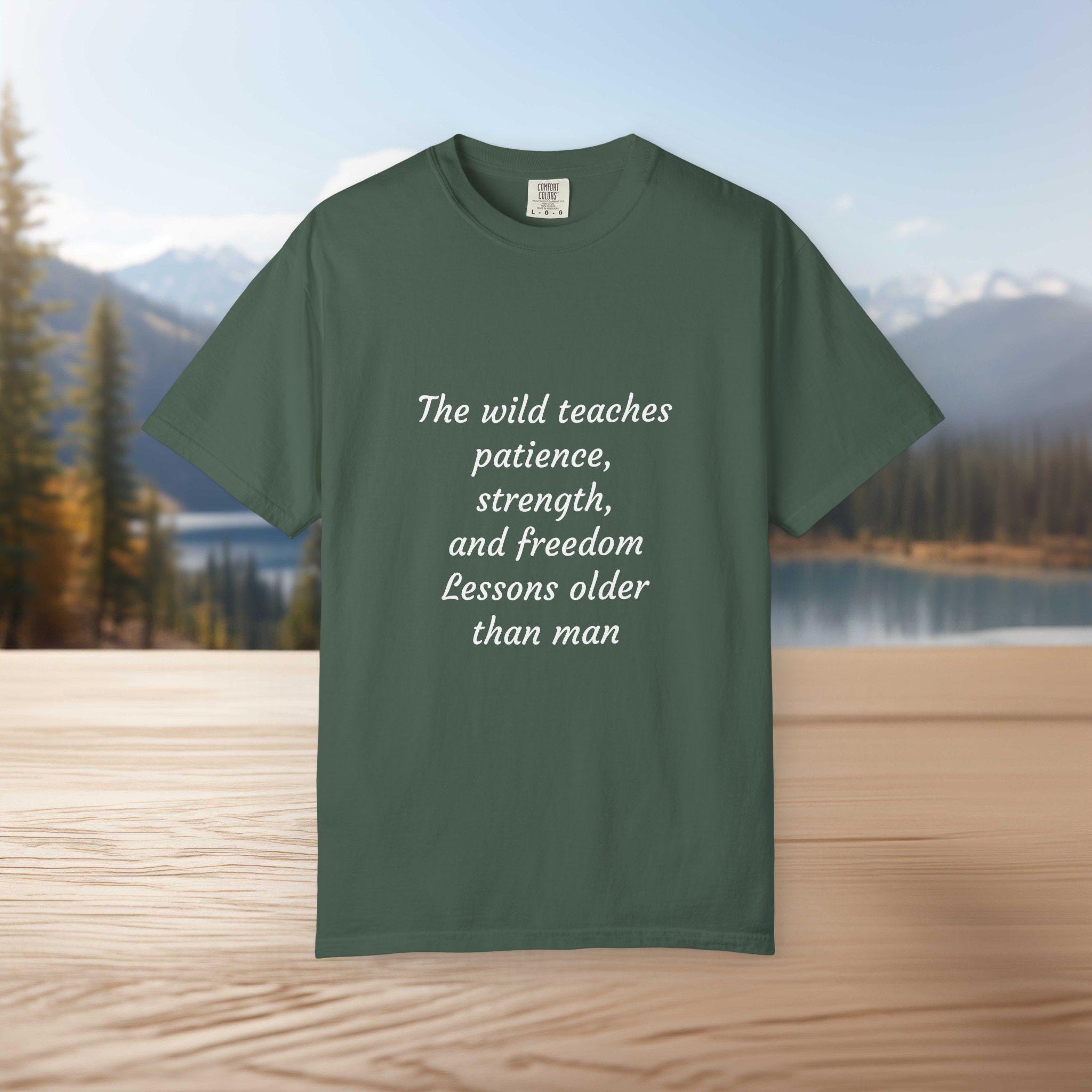 The wild teaches patience, strength, and freedom — lessons older than man. Wear the timeless wisdom of nature with this powerful quote tee. Designed for hikers, campers, and all lovers of the great outdoors, this shirt reminds us that the wilderness holds ancient truths. Whether you're wandering through forests, climbing mountains, or simply appreciating the stillness of nature, this shirt speaks to the soul of the wild.