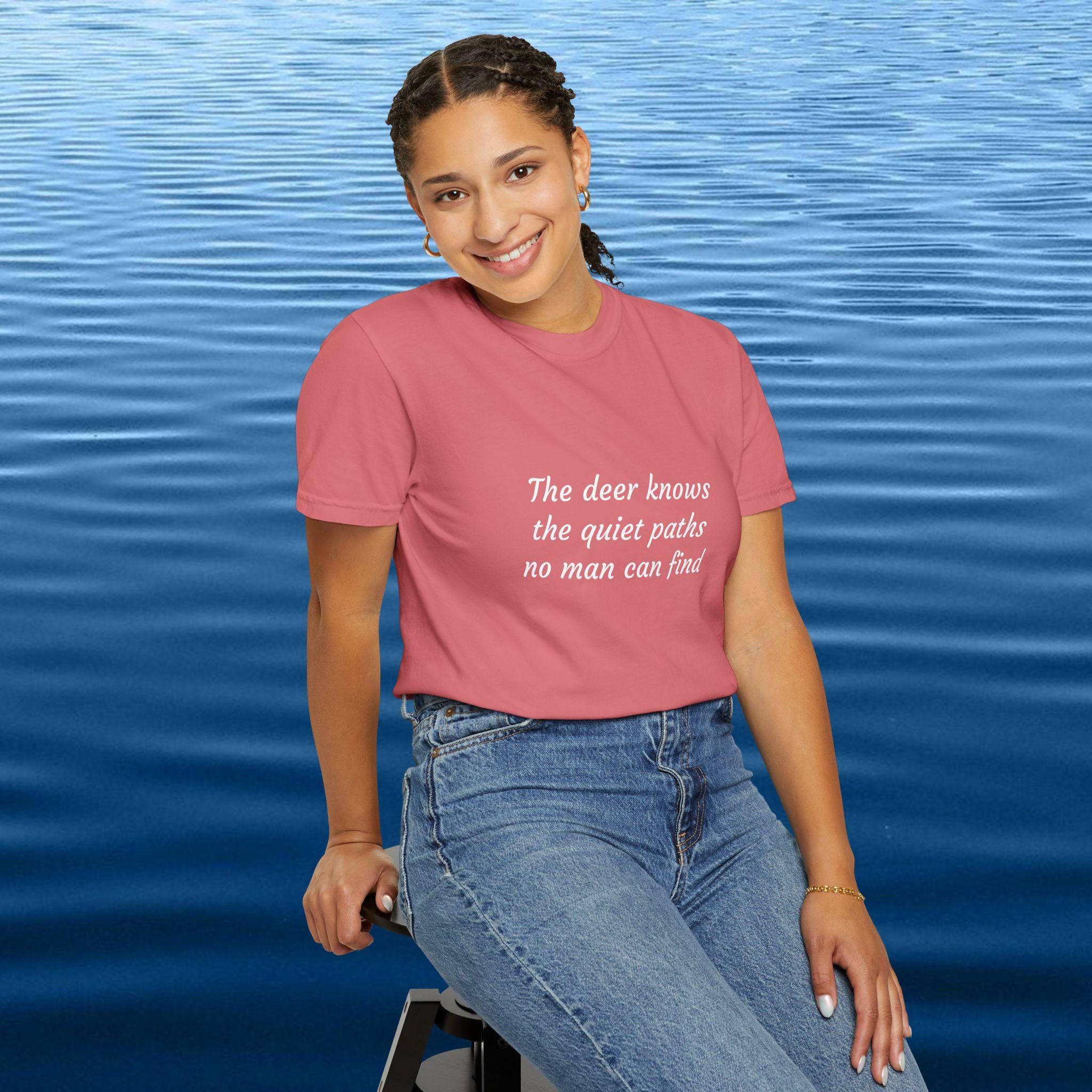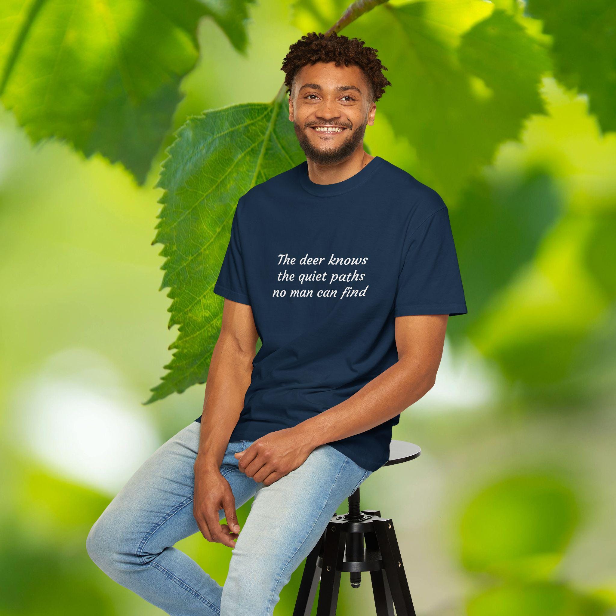 Some paths aren’t on maps — they’re whispered through the wild. Celebrate the quiet wisdom of the forest with this evocative t-shirt featuring the saying "The deer knows the quiet paths no man can find." It’s a tribute to the silent, sacred ways of wildlife and the mysteries of nature that remain untouched by man.