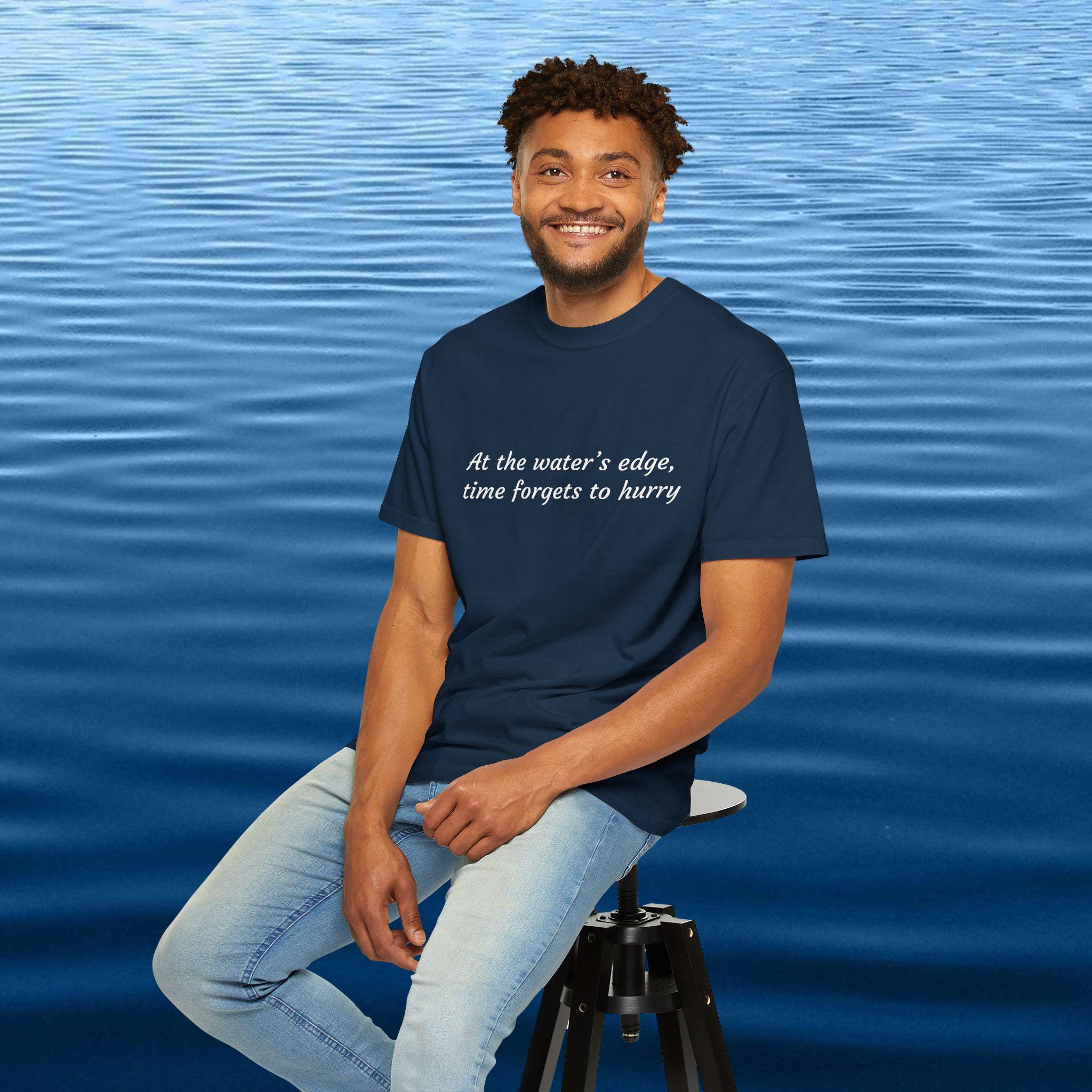Let the rush of the world drift away. This beautifully soft t-shirt features the poetic phrase "At the water’s edge, time forgets to hurry" — a gentle reminder to pause, breathe, and savor the stillness. Whether you're spending weekends by the lake, kayaking at dawn, or unwinding at a quiet cabin, this shirt brings calm wherever you go.