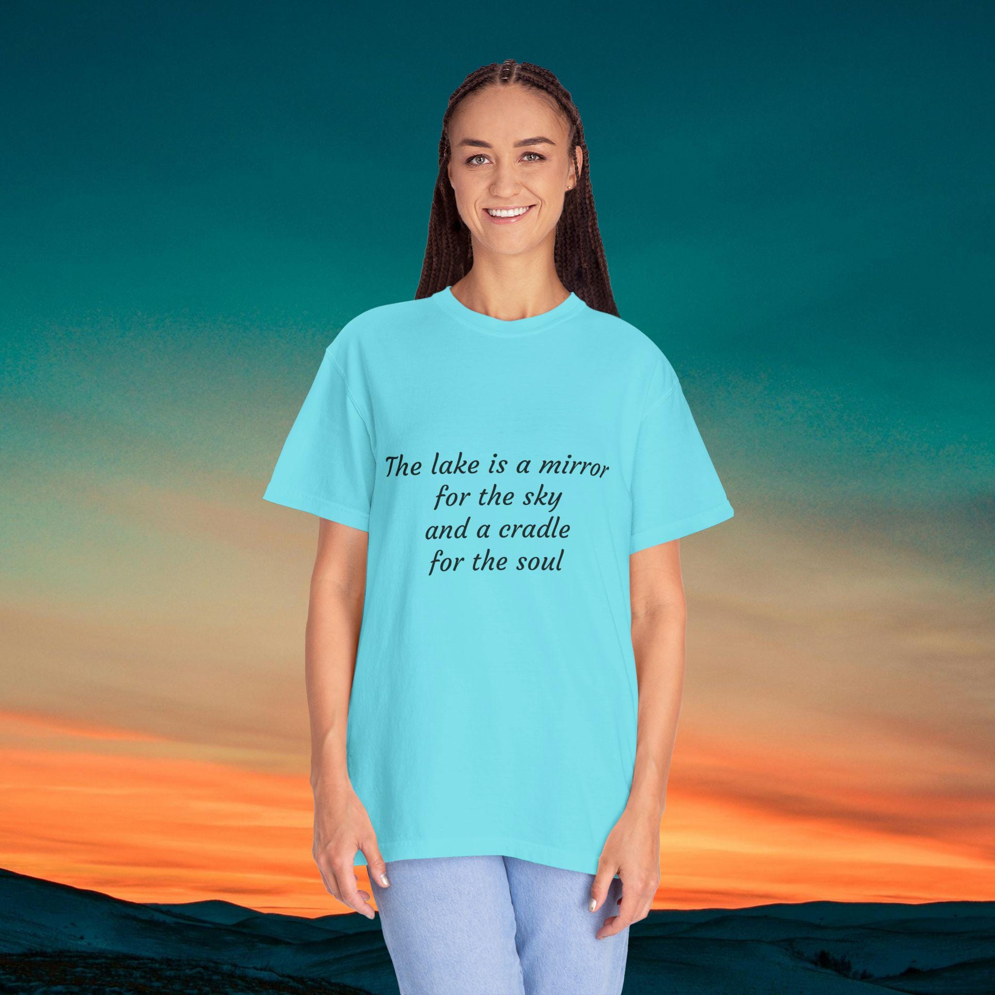 Let the lake sing to your soul. This poetic t-shirt captures the gentle spirit of lake life with the phrase "The song of the lake is written in ripples and wingbeats." It's a serene tribute to quiet mornings, drifting water, and the graceful flight of birds across the sky. Ideal for nature lovers, birdwatchers, and anyone who finds music in stillness and motion.