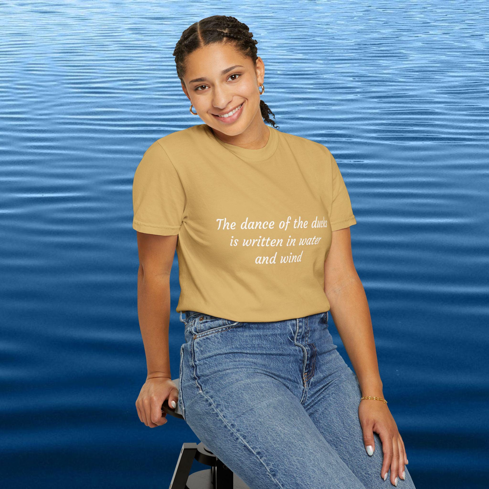 Graceful, fleeting, and full of wild poetry. Celebrate the beauty of nature’s quiet choreography with this unique t-shirt featuring the saying "The dance of the ducks is written in water and wind." It captures the elegance of ducks gliding across a lake or lifting into the breeze — a scene that speaks to peace, rhythm, and connection to the wild.