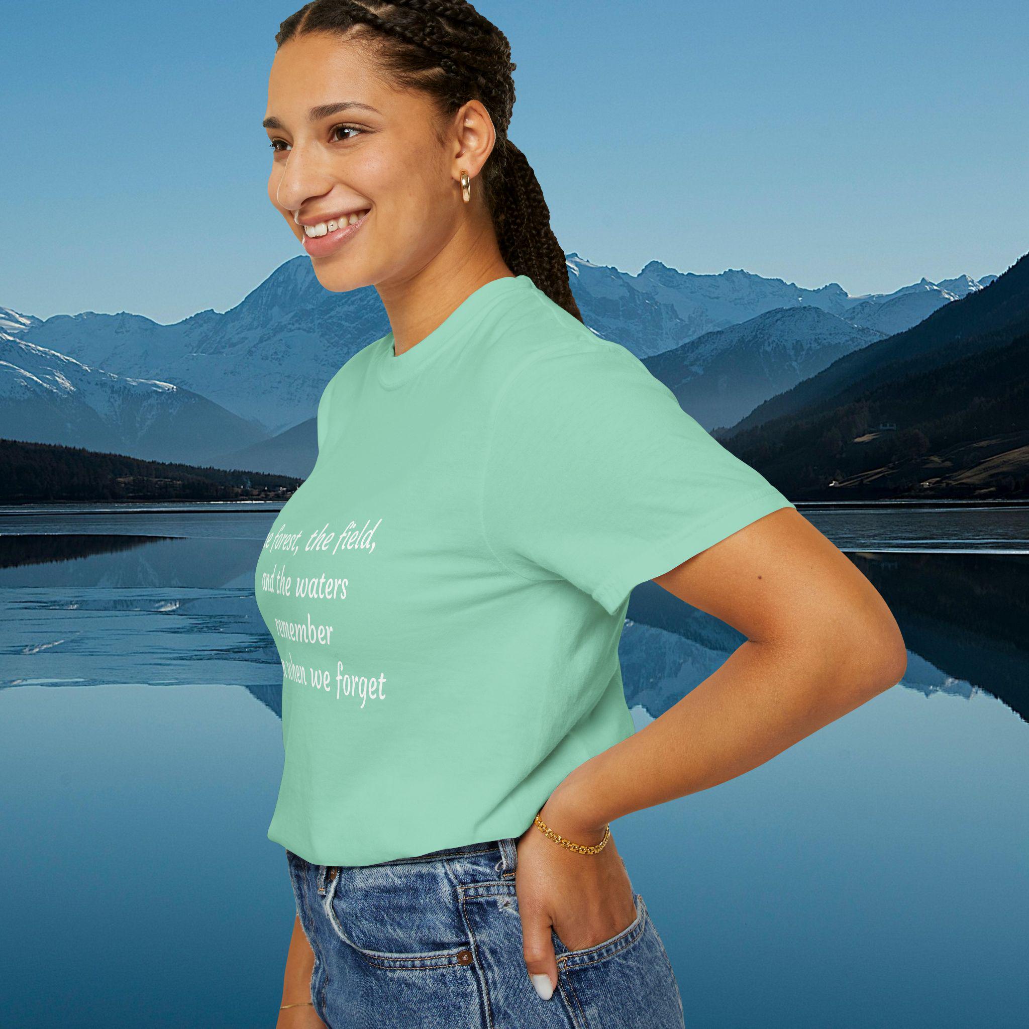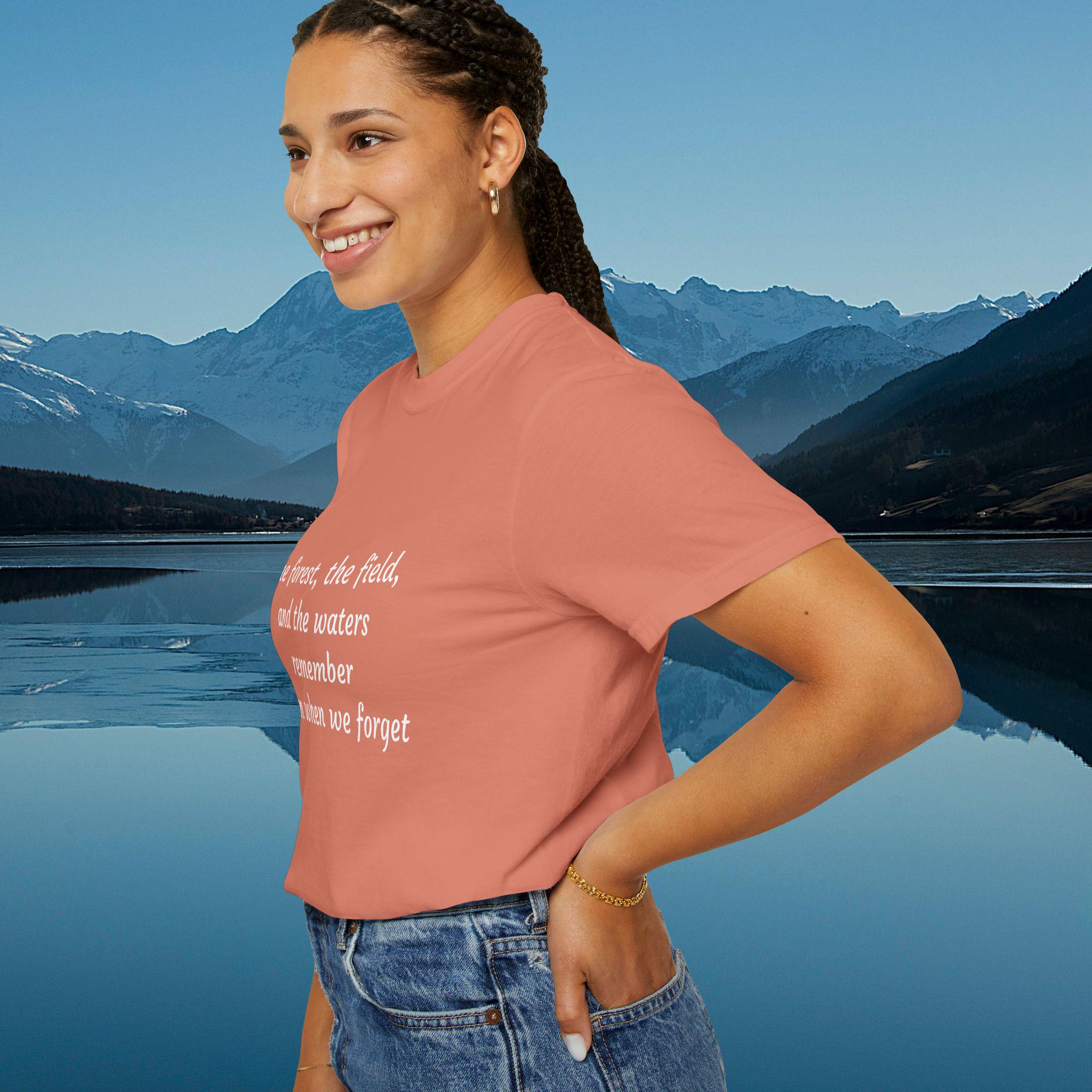 The Earth holds every story, even the ones we leave behind. Featuring the reflective phrase "The forest, the field, and the waters remember — even when we forget," this t-shirt is a quiet tribute to the timeless memory of the natural world. A reminder that while human moments may fade, the land carries our footprints, our echoes, and our essence.