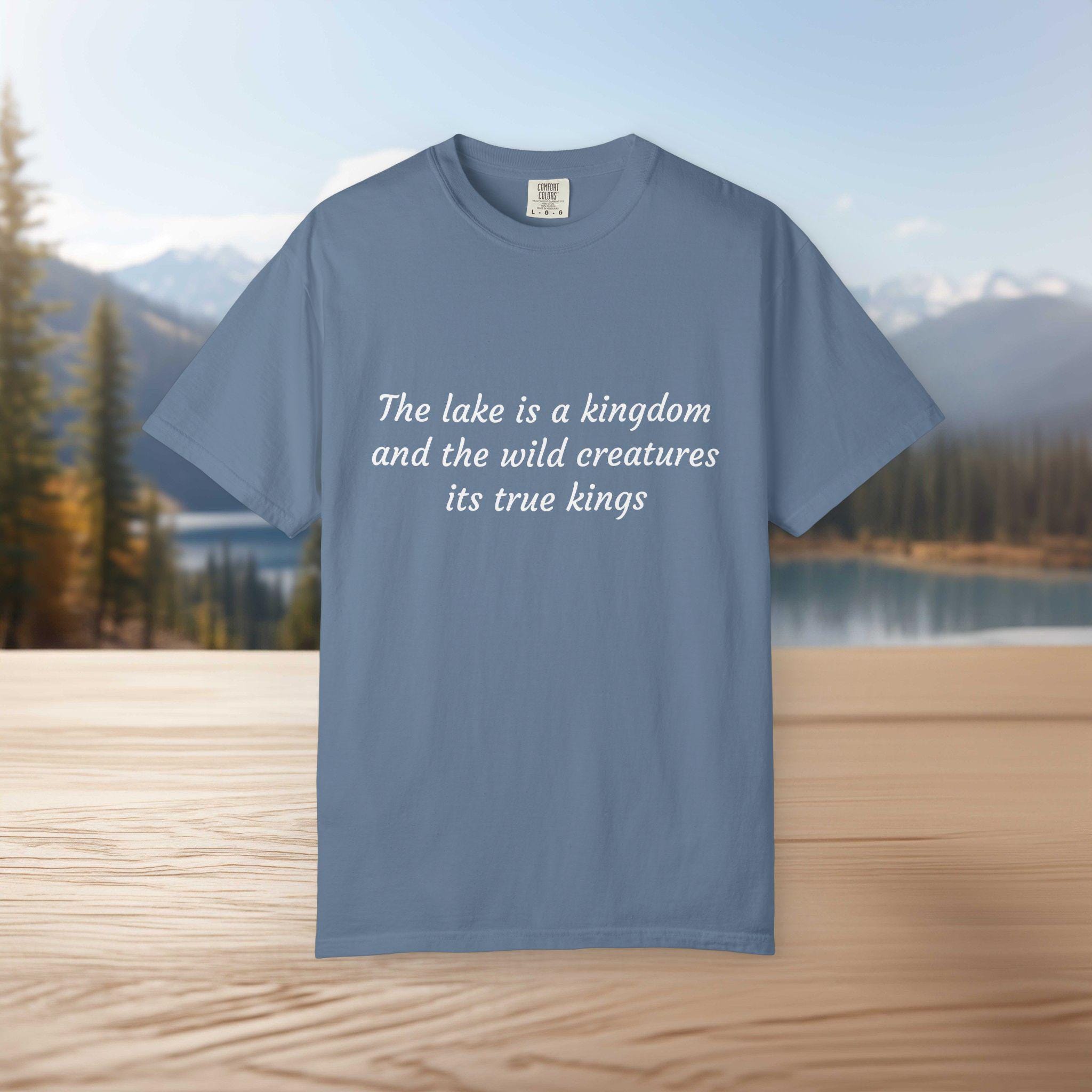 Long live the wild. Celebrate the untamed beauty of the natural world with this bold, poetic t-shirt featuring the phrase "The lake is a kingdom, and the wild creatures its true kings." A tribute to deer in the mist, loons on the water, and bears at the shore — this shirt honors the real rulers of the wilderness.