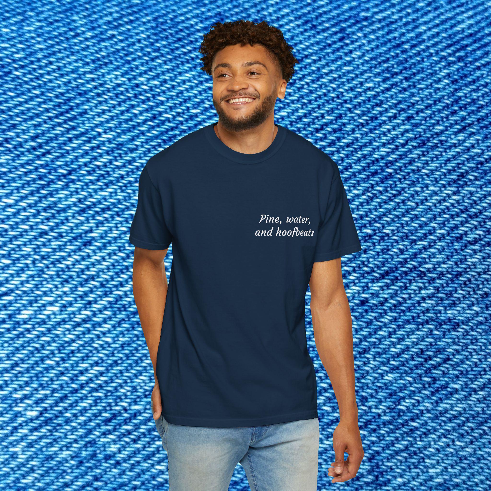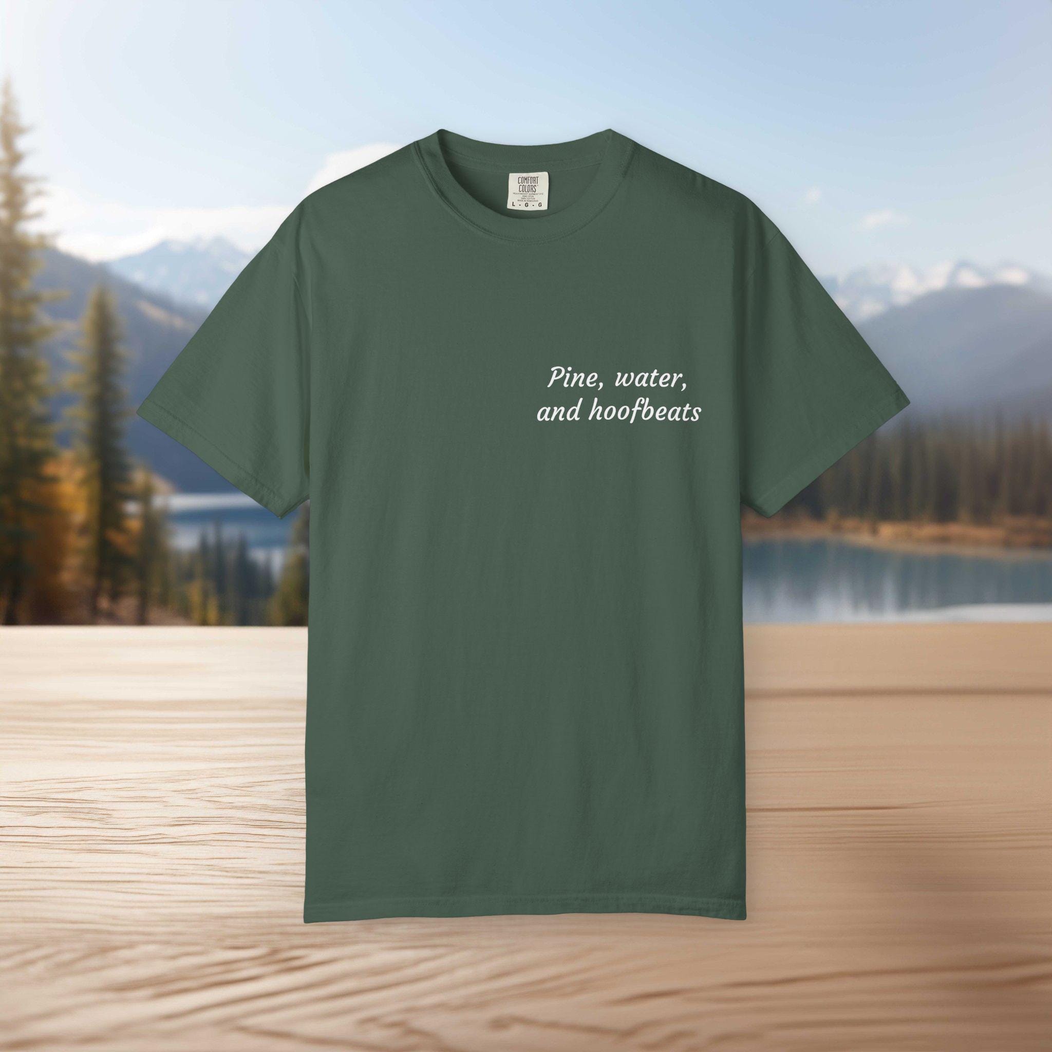 Where the wild breathes softly. This minimalist and powerful t-shirt features the phrase "Pine, water, and hoofbeats" — three simple words that evoke the raw essence of the wilderness. It's a tribute to mossy trails, still lakes, and the quiet thunder of deer, elk, or moose moving through the trees.