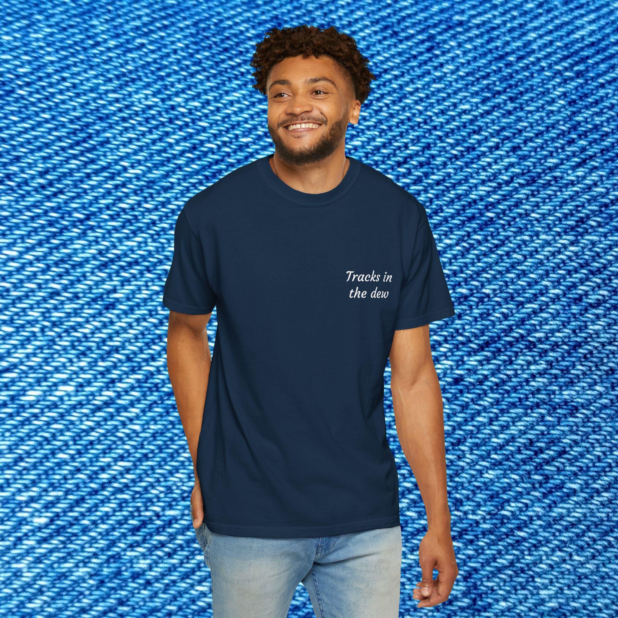 Every journey leaves a whisper. This minimalist t-shirt features the evocative phrase "Tracks in the dew," capturing the fleeting beauty of early morning in the wild — when footprints are fresh, the air is still, and the world holds its breath. Whether it’s a deer in the field or your own steps through the woods, this shirt honors the quiet stories nature tells.