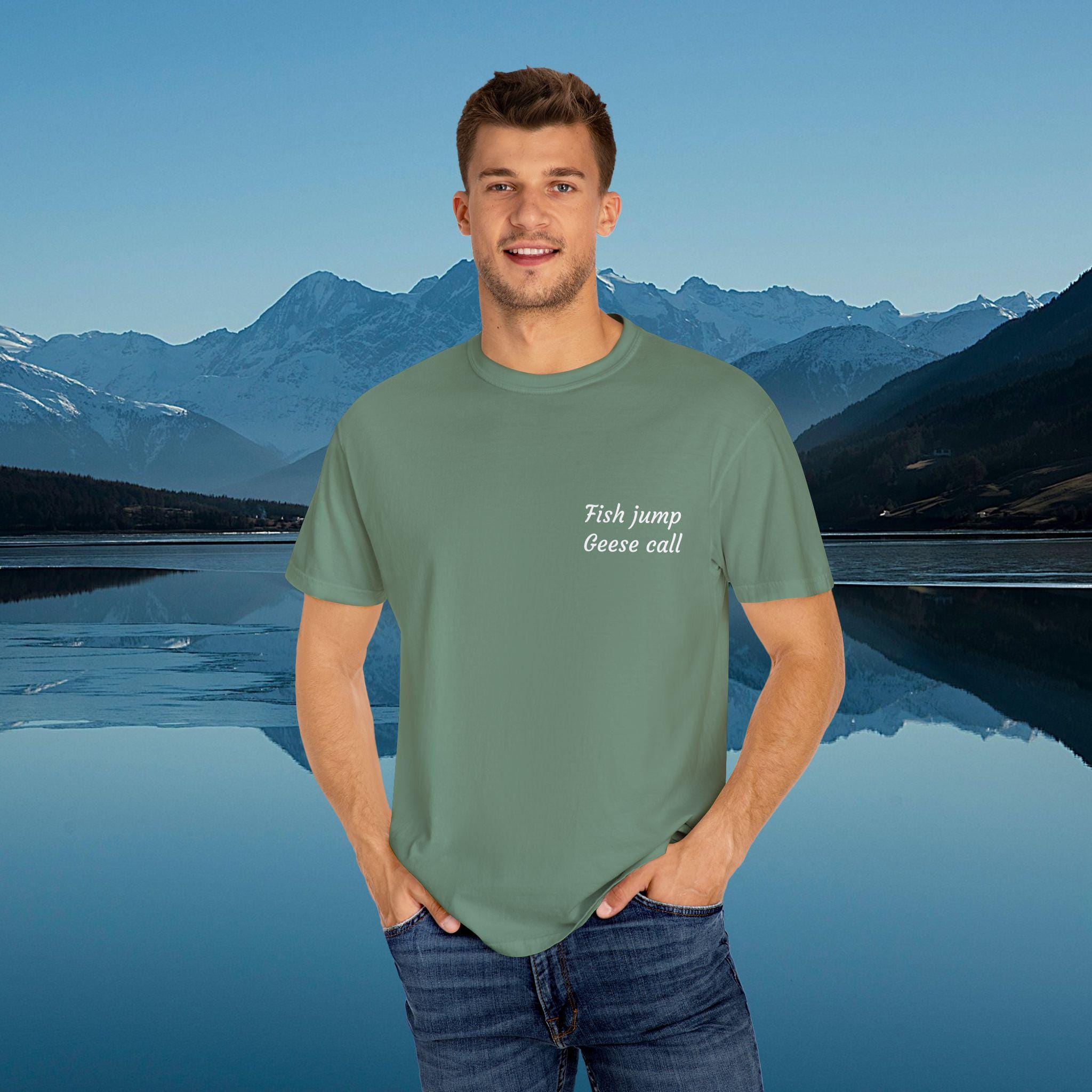 Embrace the tranquility of nature. This minimalist t-shirt features the poetic phrase "Fish jump, geese call," encapsulating the peaceful sounds of the wild. Perfect for those who find solace in the gentle rhythms of lakeside life, this tee is a subtle nod to the beauty that surrounds us.