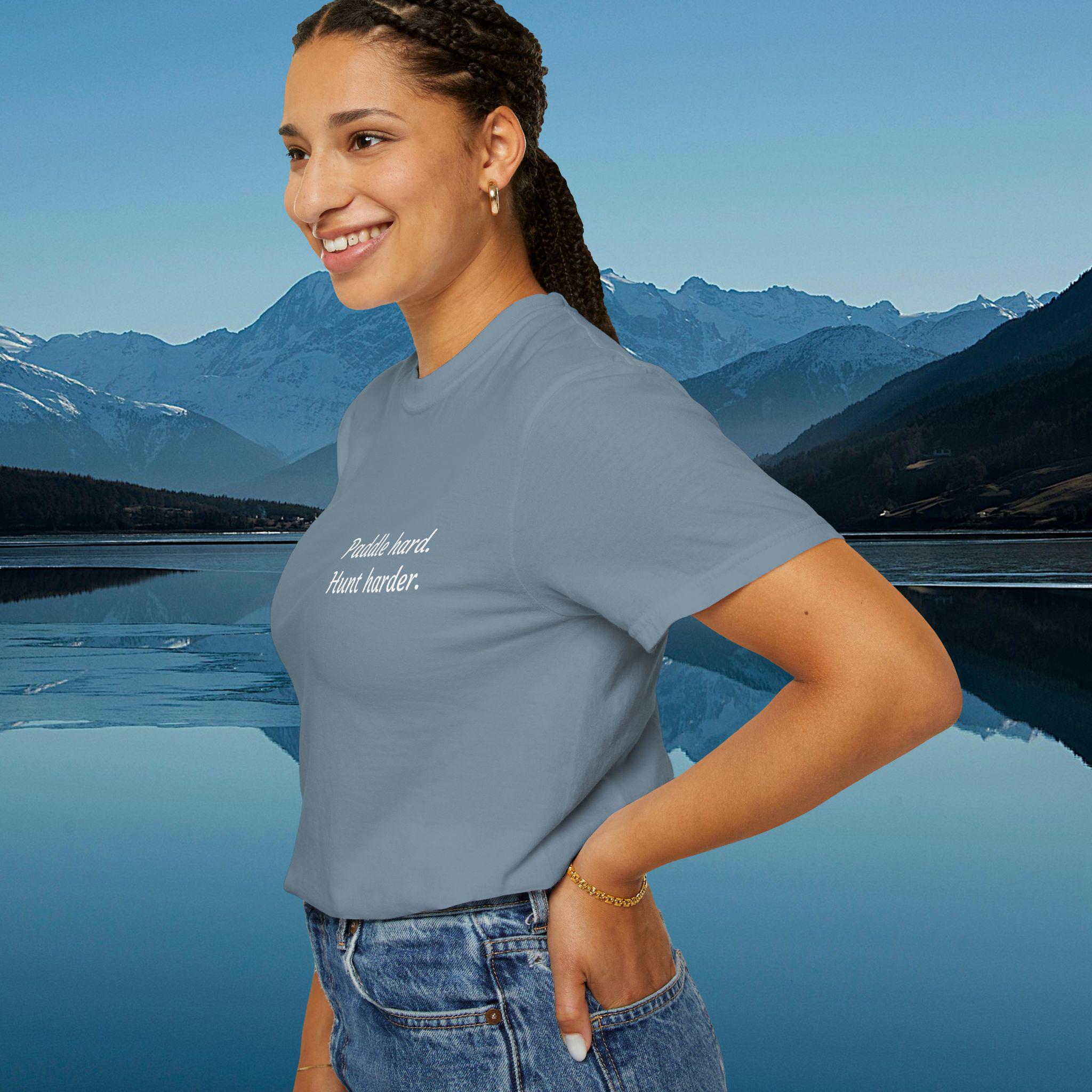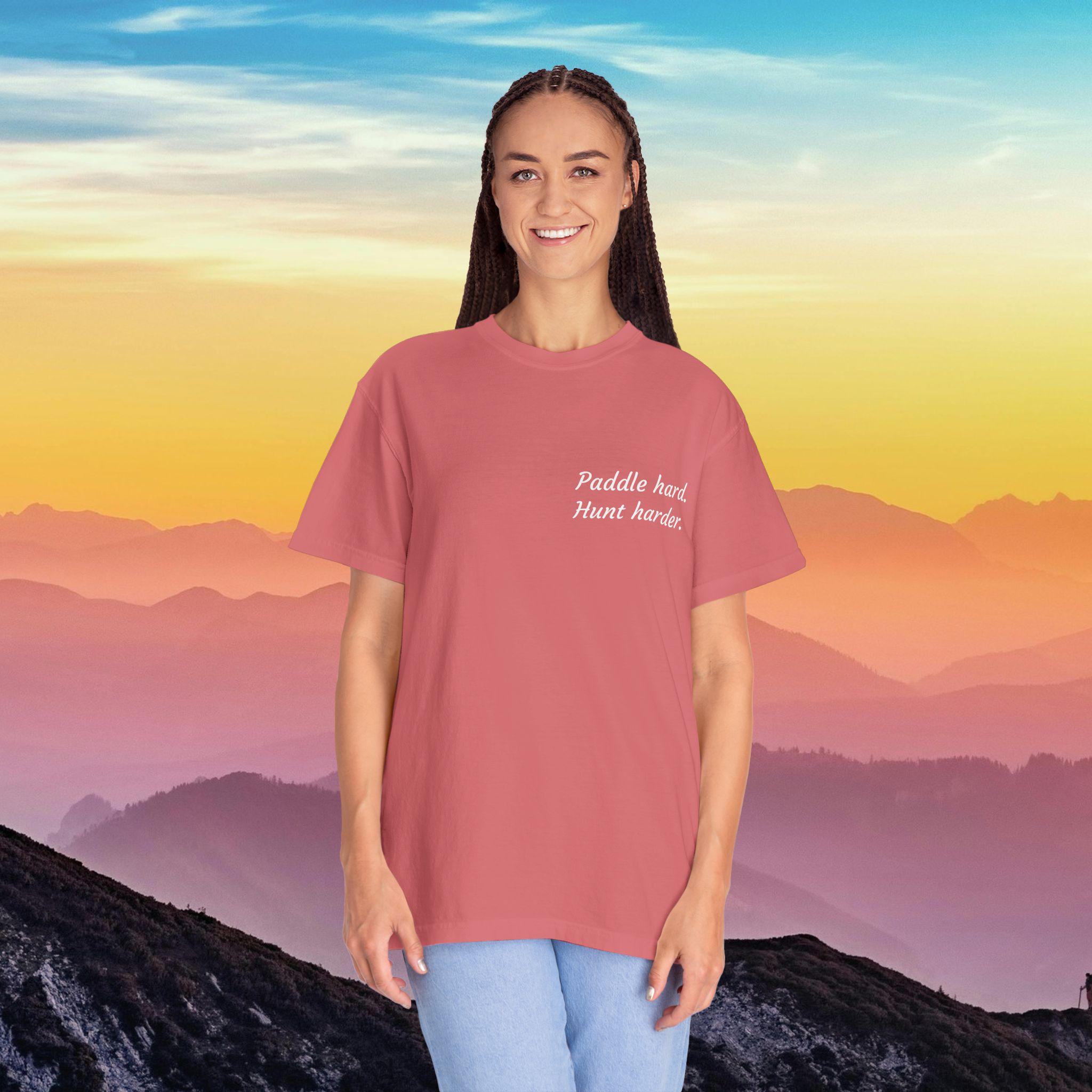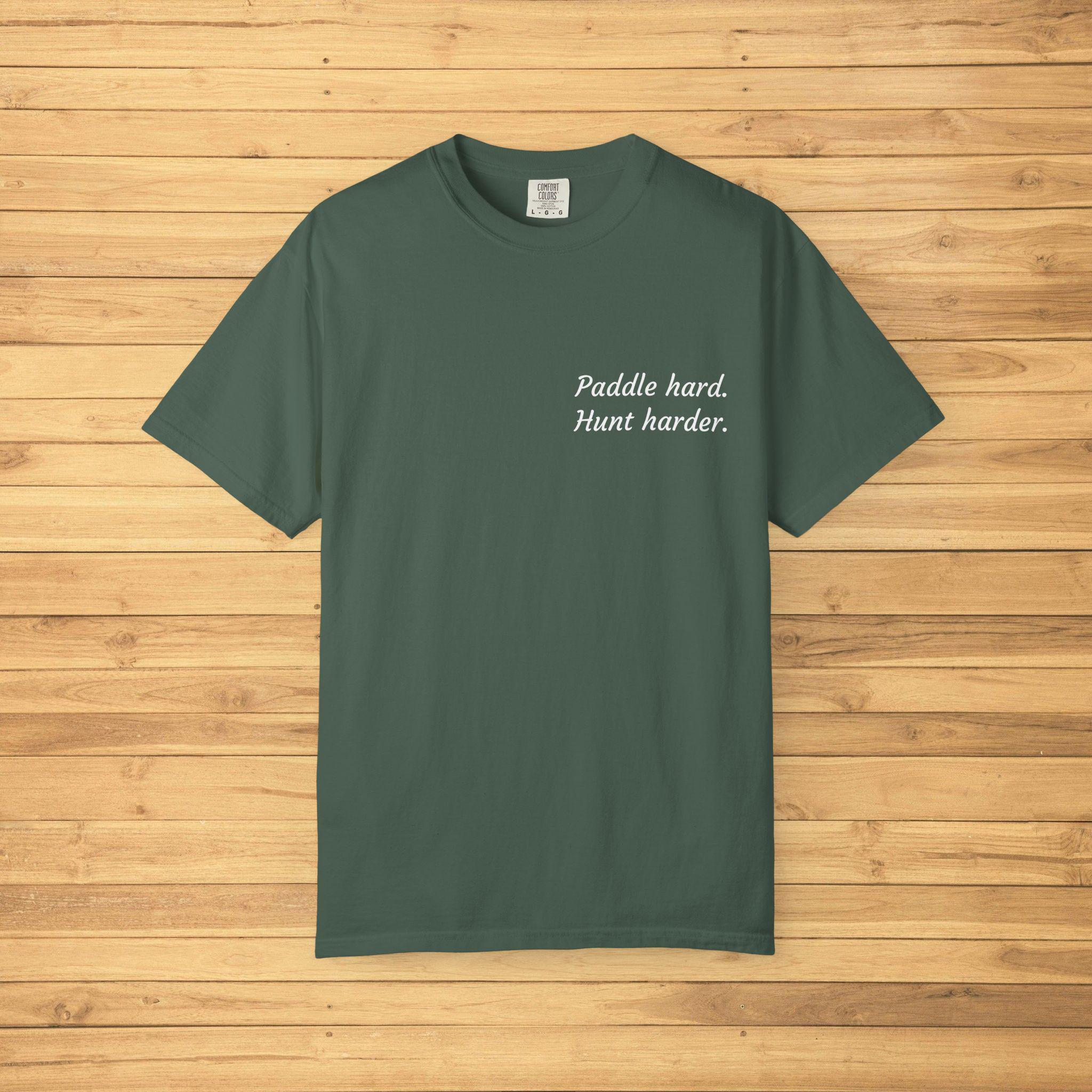 Paddle hard. Hunt harder. For those who rise before the sun, cut through glassy waters, and wait in stillness for the wild to stir — this shirt is your anthem. Whether you're chasing waterfowl by kayak, stalking whitetail through dense woods, or just living the outdoor grind, this rugged tee was made for your lifestyle.