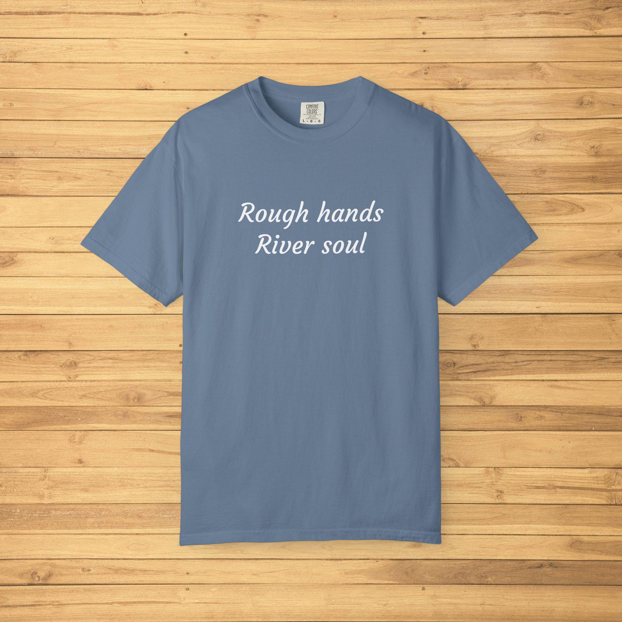 “Rough hands, river soul” — for the ones who work hard, love harder, and find peace where the current flows strong and free. This shirt speaks to a rugged life rooted in nature, where the calluses tell stories and the river carries dreams.