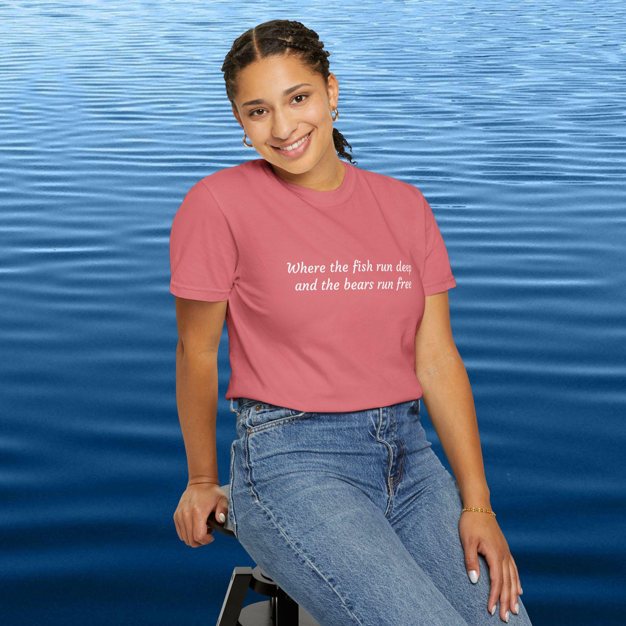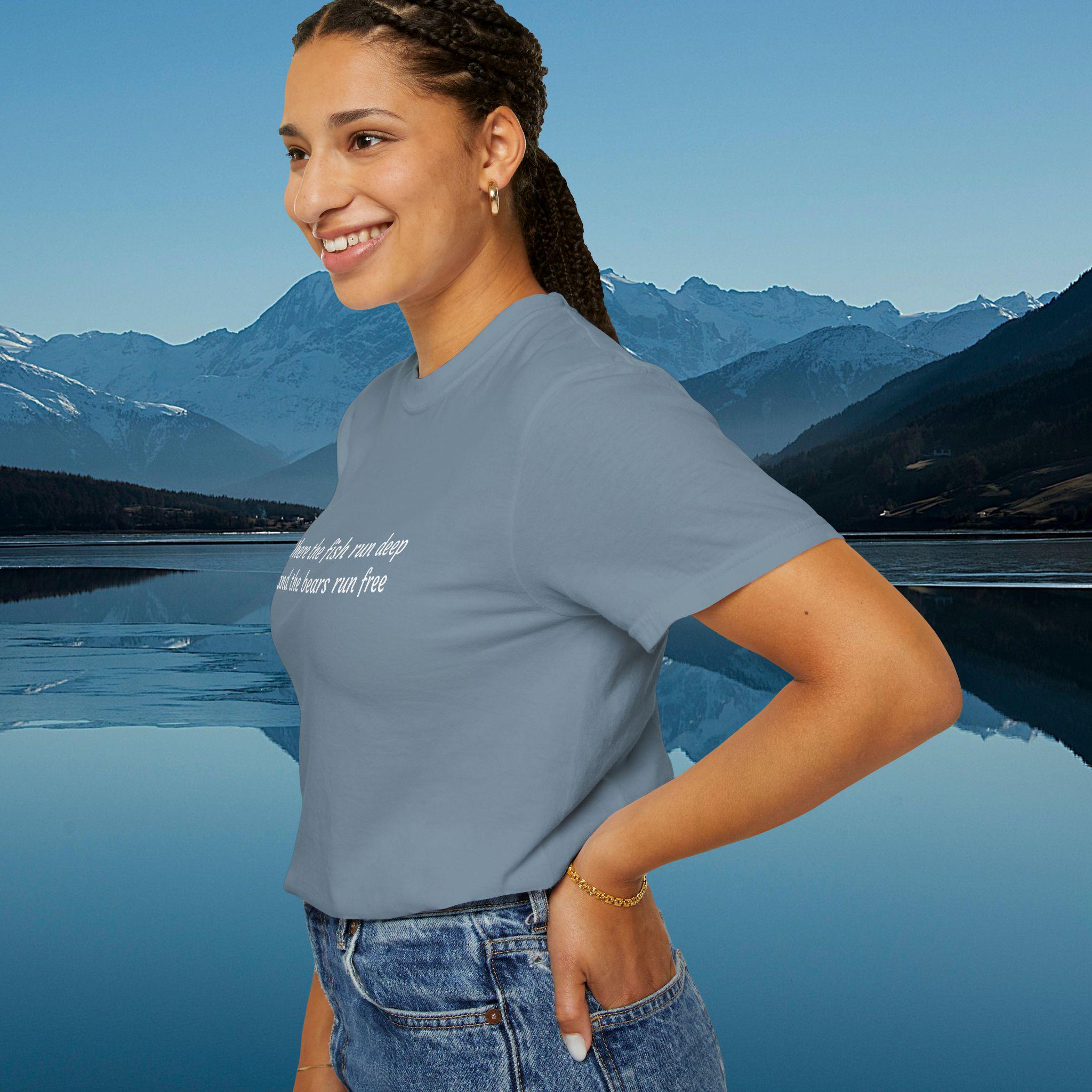 Where the fish run deep and the bears run free. Celebrate the wild places where rivers carve through forest and freedom roams on four legs. This shirt is for those who cast lines in quiet waters and walk trails where paw prints lead the way. It’s more than a tee — it’s a tribute to untamed lands and the souls who call them home.