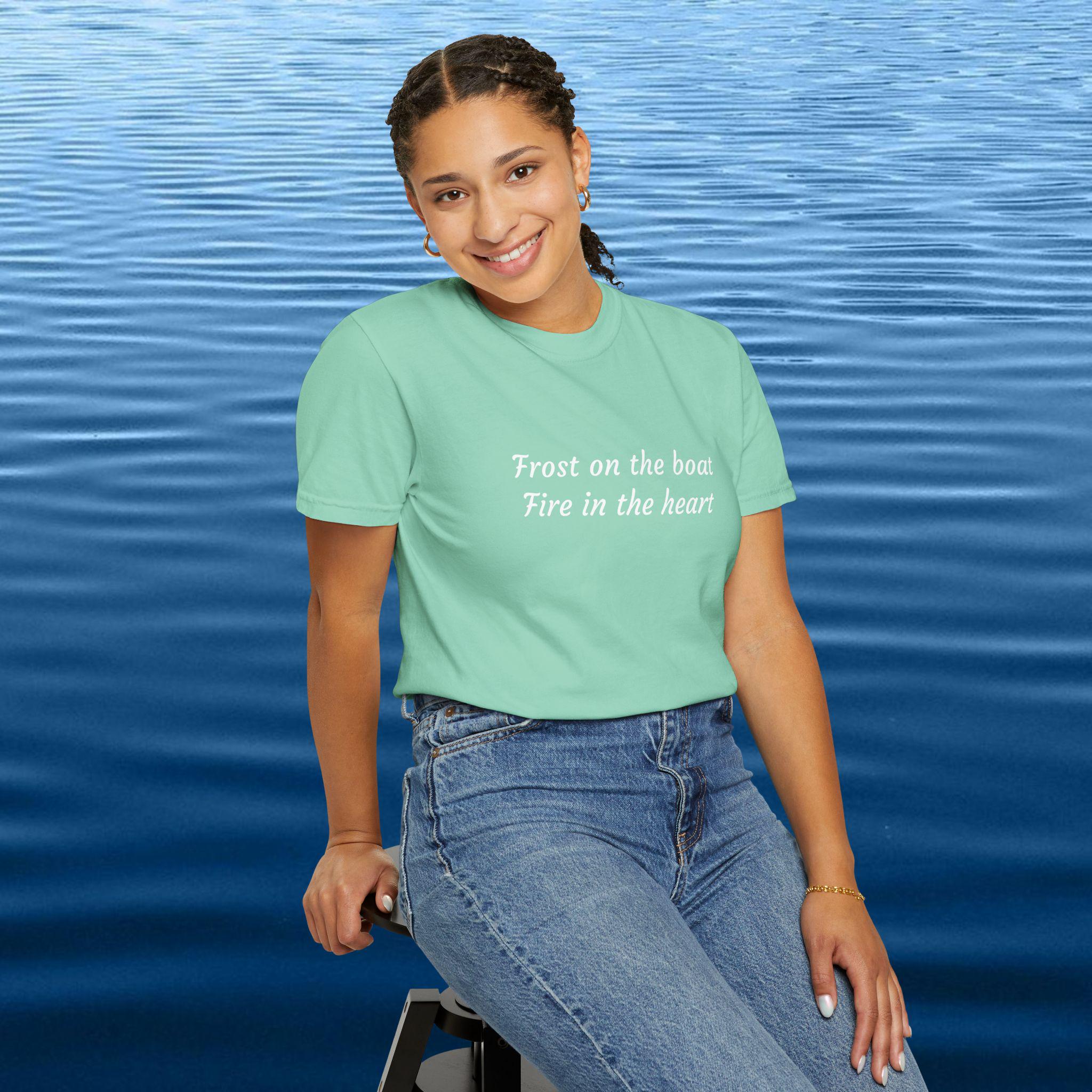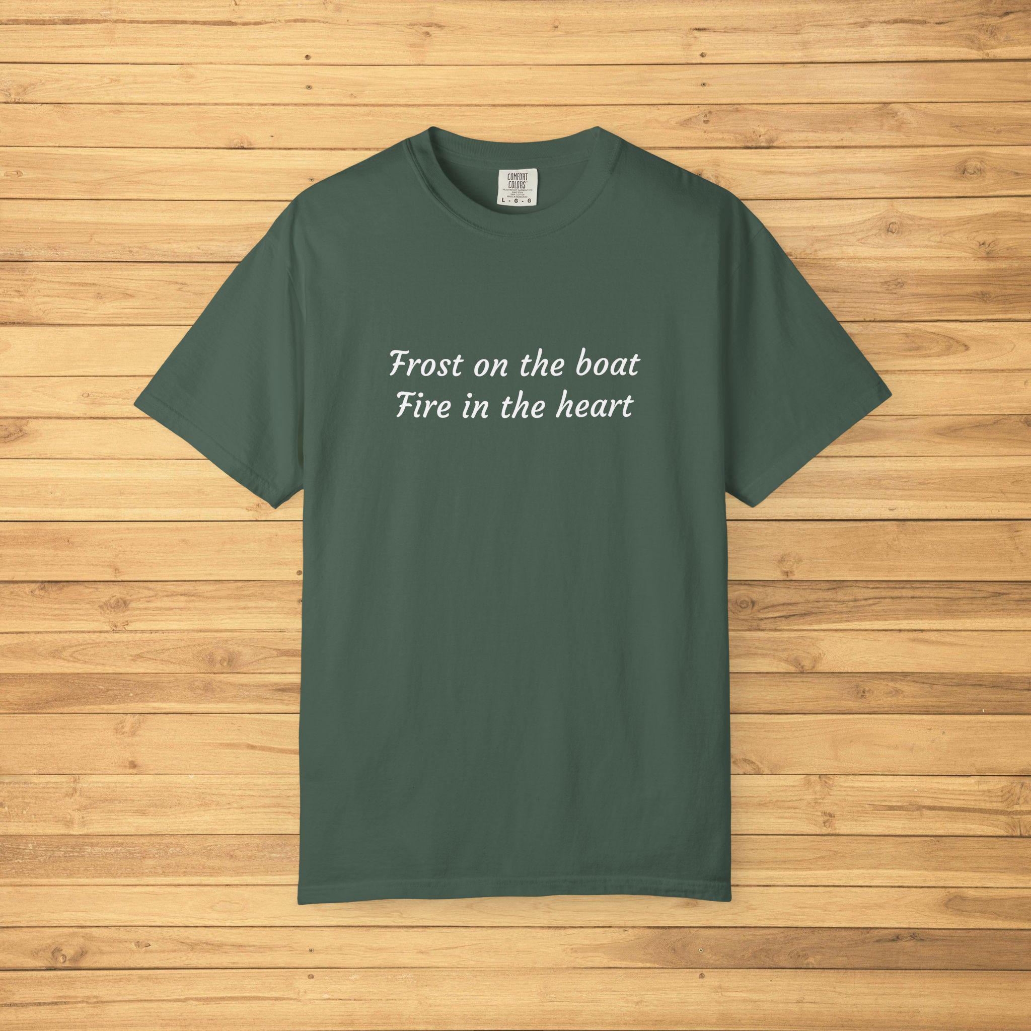 Frost on the boat, fire in the heart — for those who brave frozen mornings, cast lines through the cold, and find warmth in wild adventure. This shirt honors the spirit of winter anglers and wilderness lovers who know that icy waters can’t chill a burning passion for the outdoors.