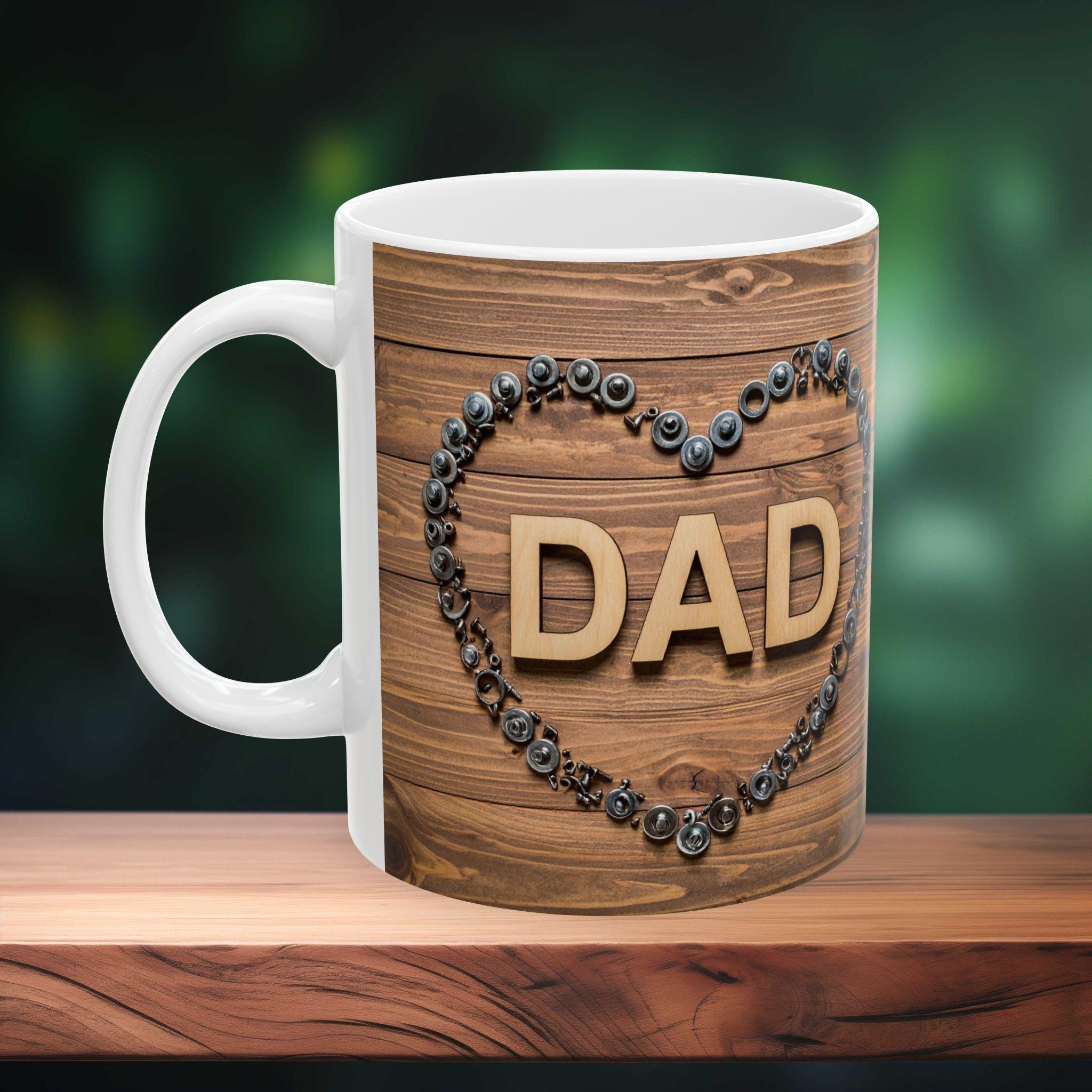Celebrate craftsmanship and love with this unique ceramic mug featuring a heart made from screws and nails set on a rustic wooden background. Perfect for dads, grandpas, handymen, woodworkers, or anyone who builds with heart and hands.
