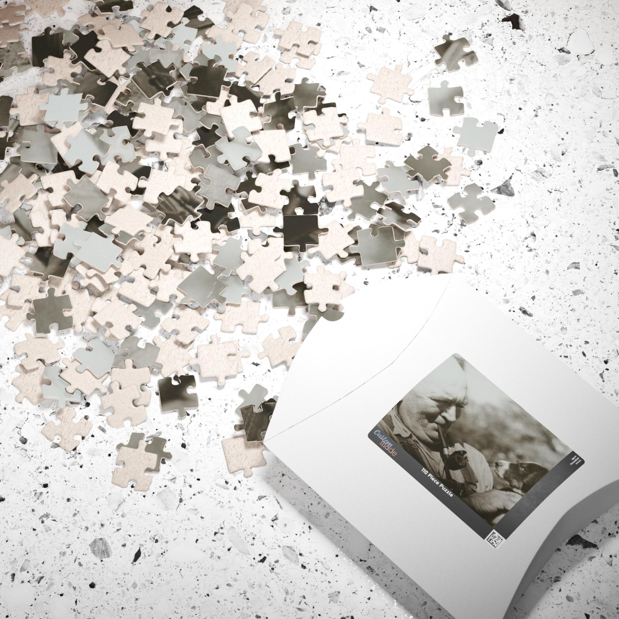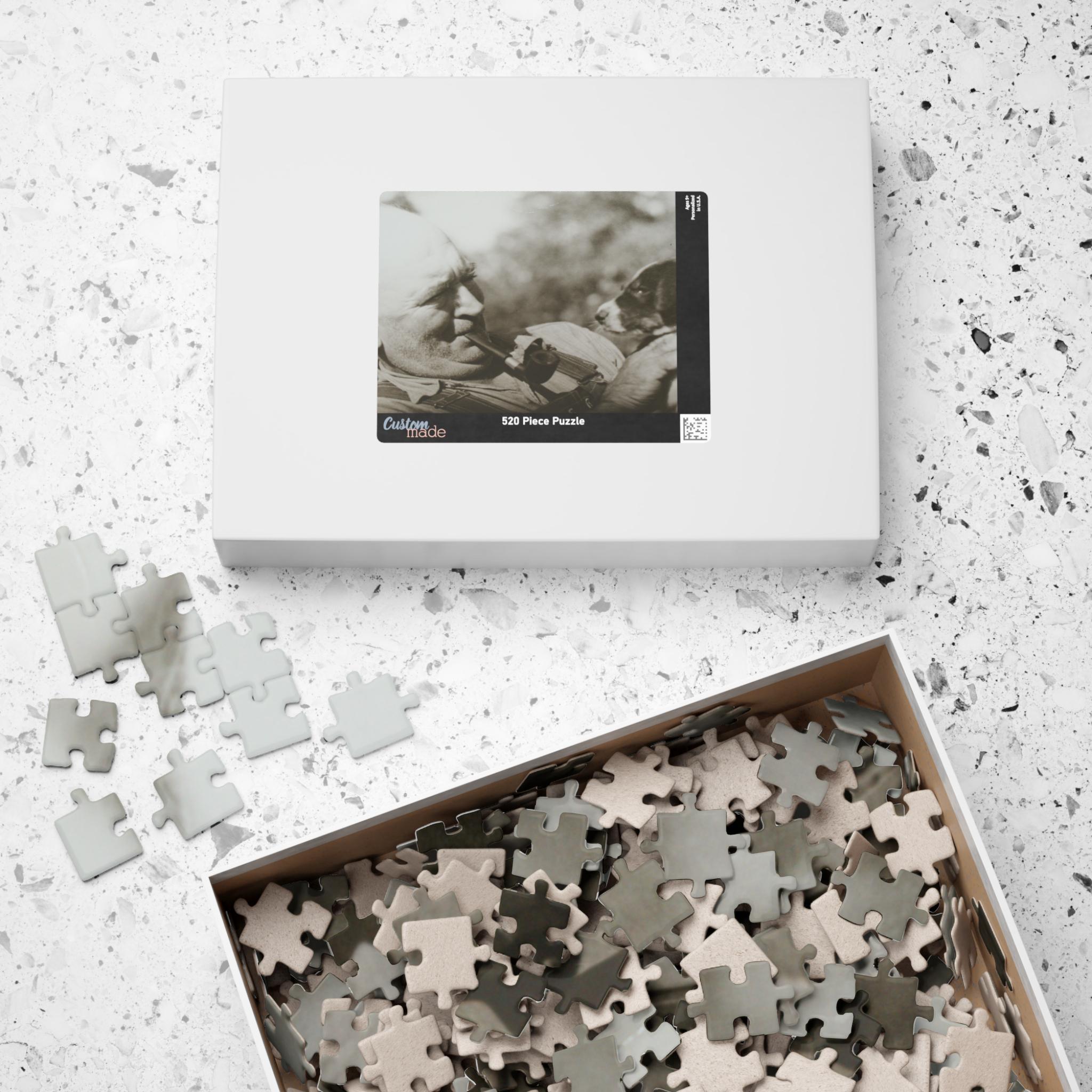 Step into a timeless moment of rural life with this black-and-white jigsaw puzzle titled “Farmer & Puppy.”