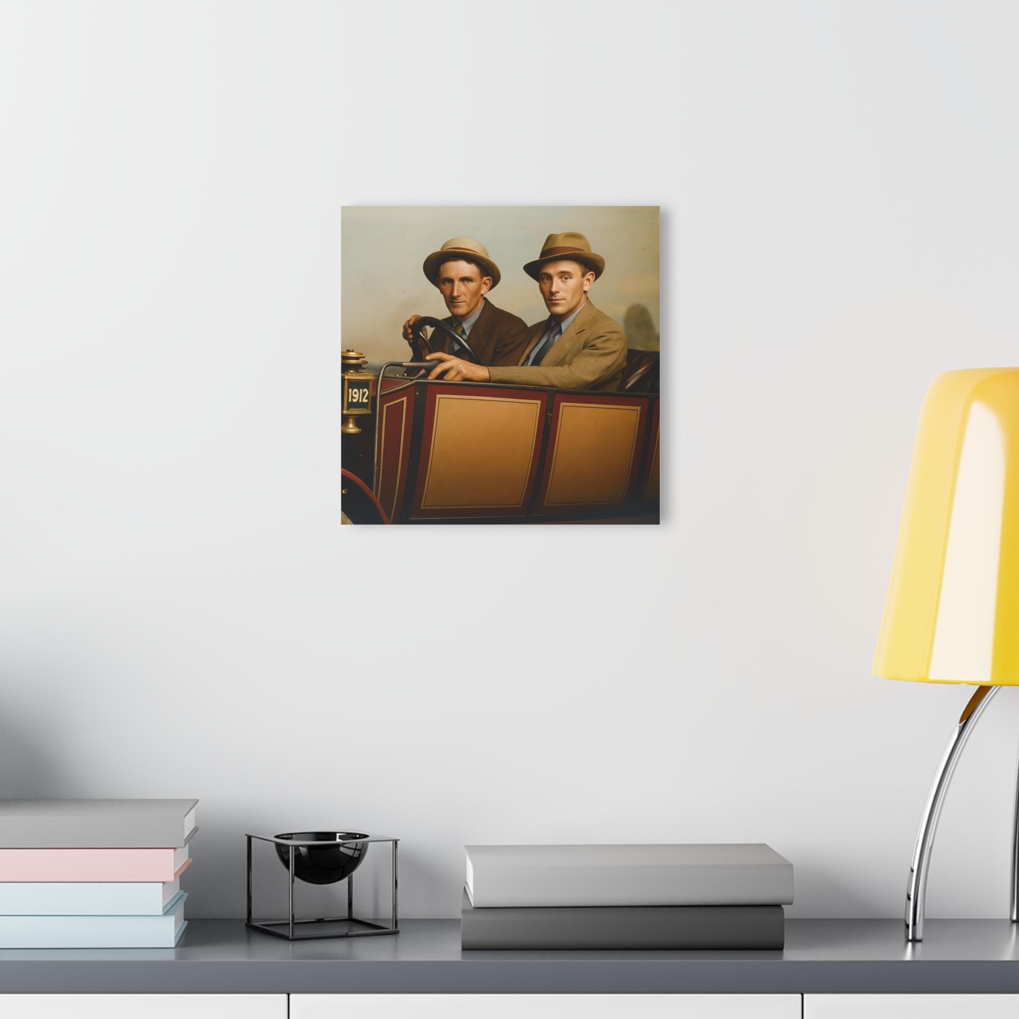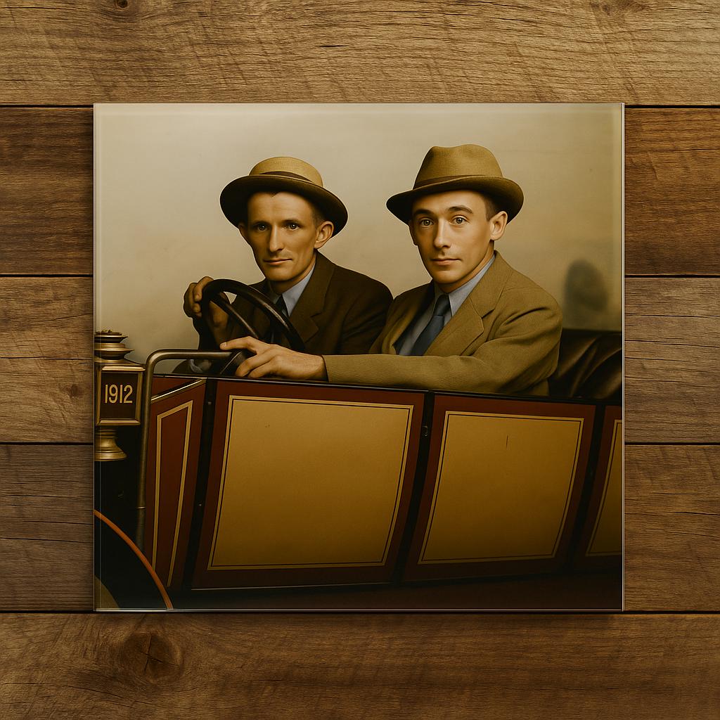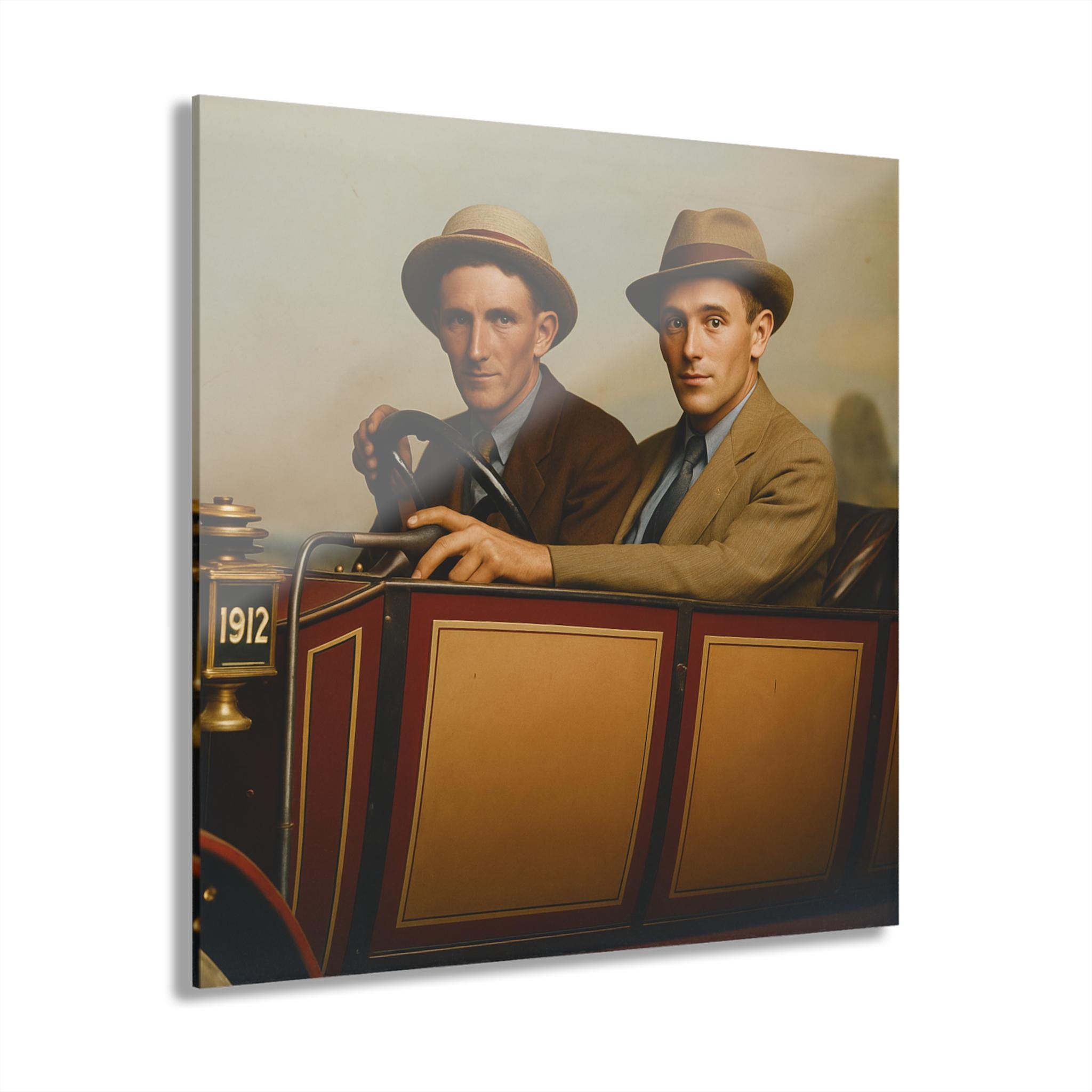Bring history to life with this beautifully restored 1912 vintage car photo, printed in striking detail on acrylic glass. Perfect for collectors, car enthusiasts, or anyone who loves timeless Americana, this wall art captures two young men proudly seated in their early automobile — a snapshot of innovation and adventure from a century ago.