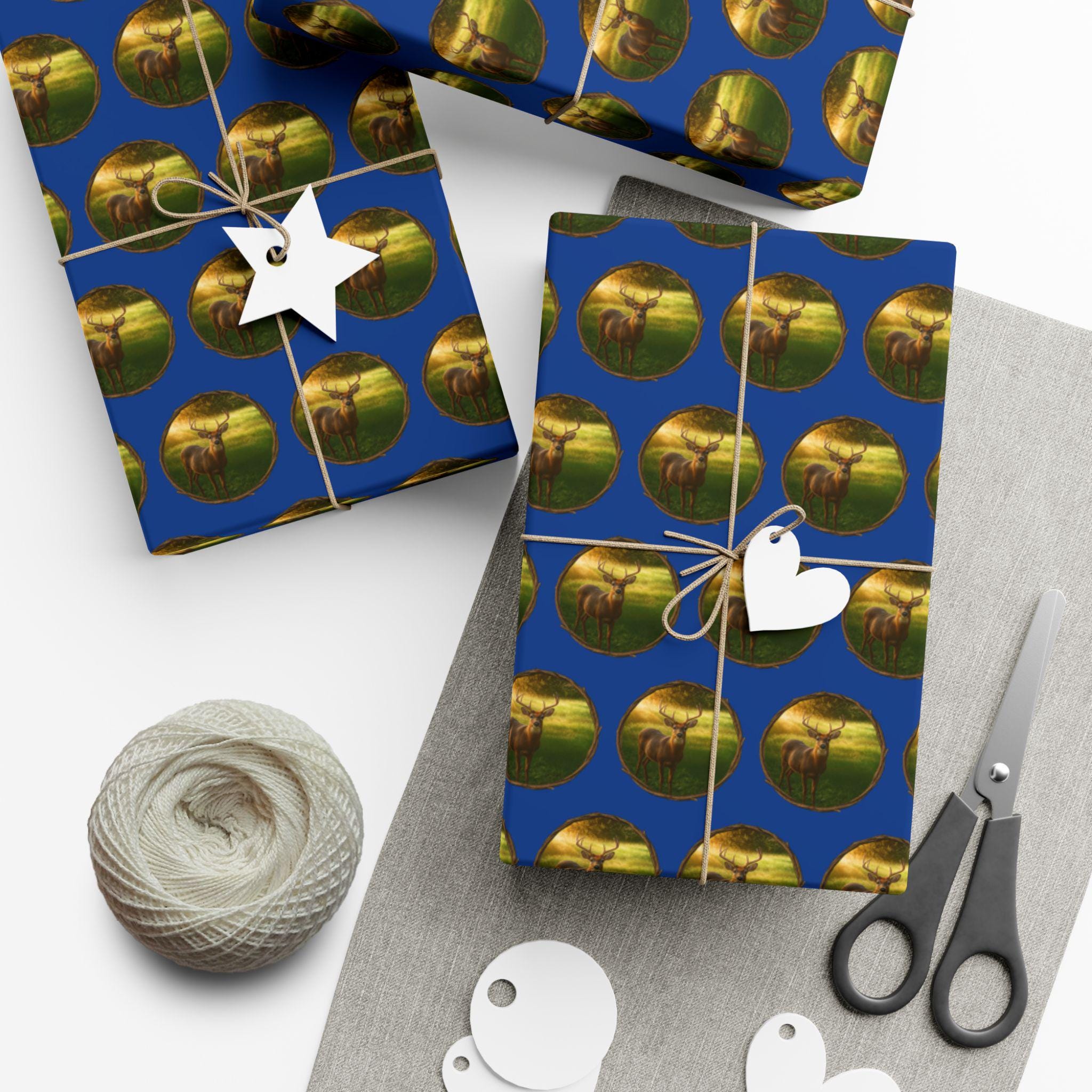 Descriptive Phrases - deer wrapping paper - woodland gift wrap - wildlife print gift wrap - rustic cabin wrapping paper - buck in sunlight paper roll - nature lover gift wrap - forest theme gift wrap - rustic deer pattern paper - outdoor hunting decor - Rustic wrapping paper featuring a deer standing in morning sunlight inside a circle of branches. - Forest-themed wildlife design by Wildlife By Richard USA made from a photo of a deer.