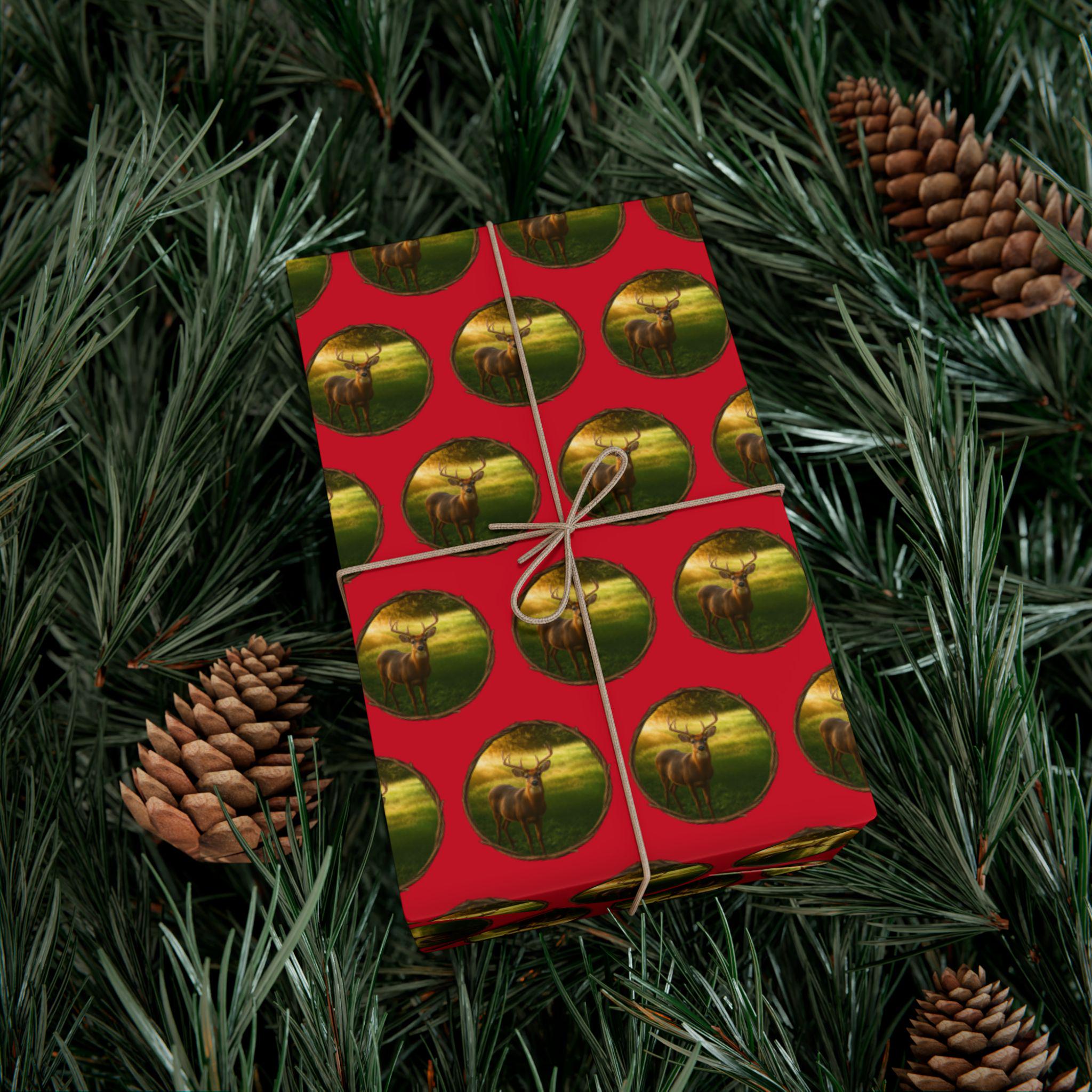 Wrapping Paper Deer in Morning Sunlight Rustic Woodland Gift Wrap Forest Wildlife Design Red Background