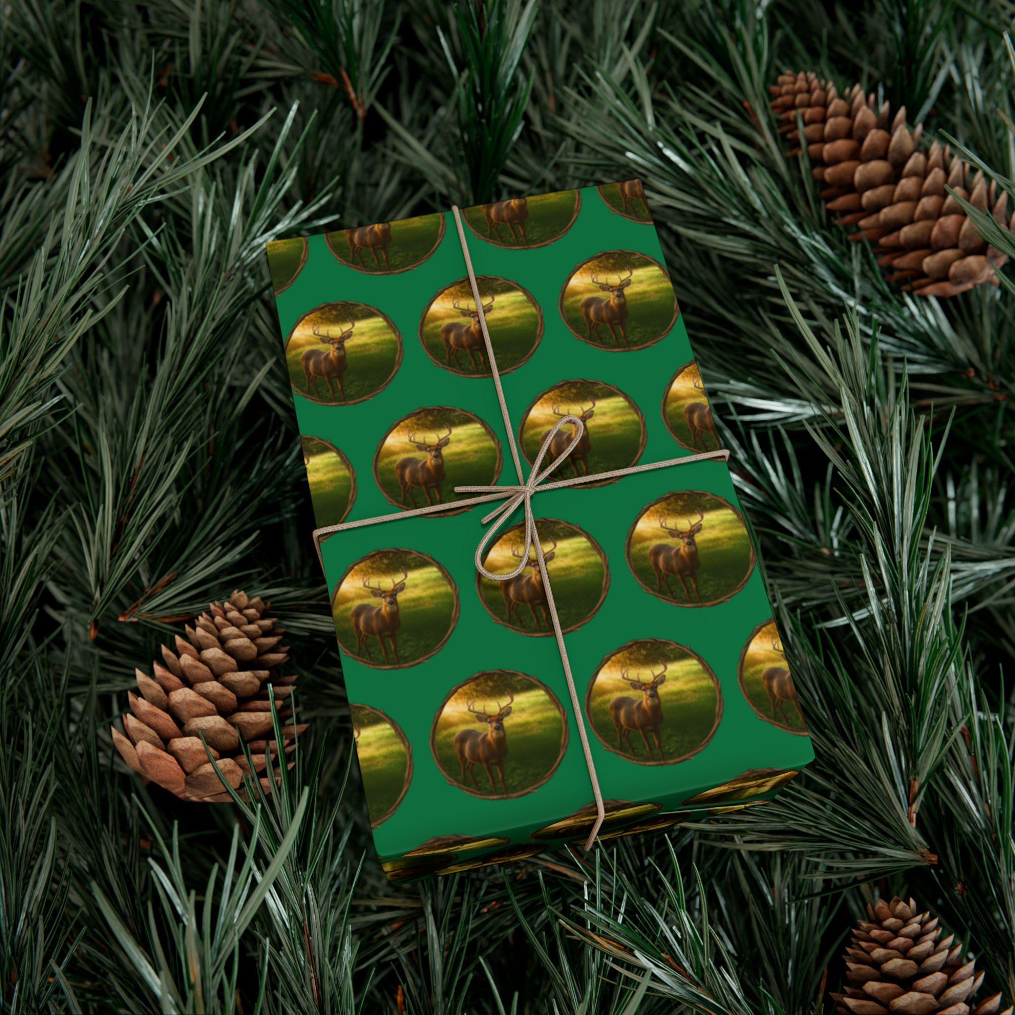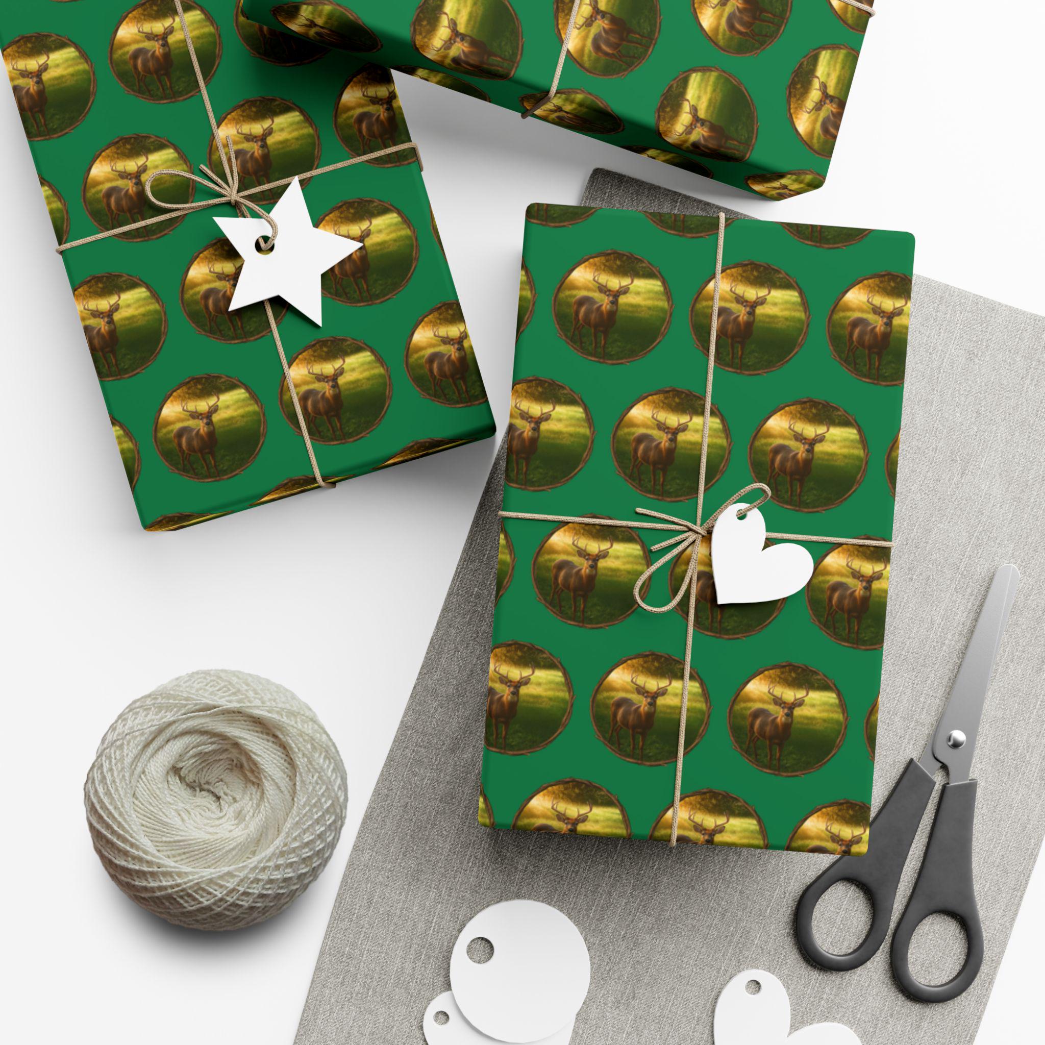 Wrapping Paper Deer in Morning Sunlight Rustic Woodland Gift Wrap Forest Wildlife Design Green Background