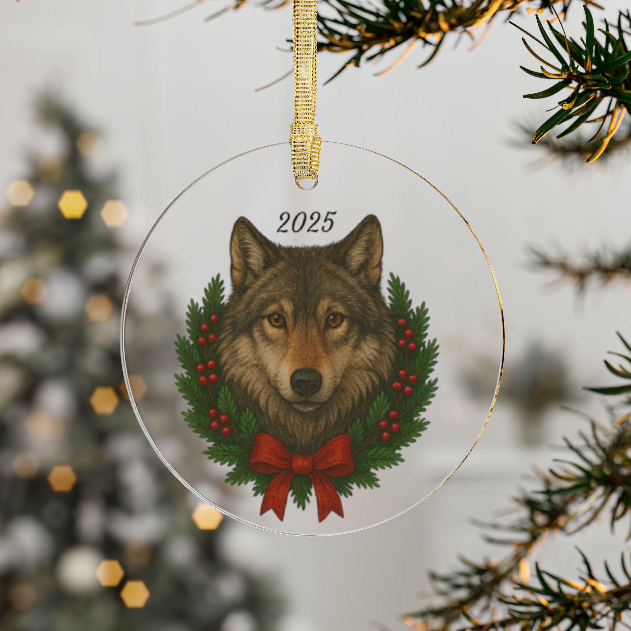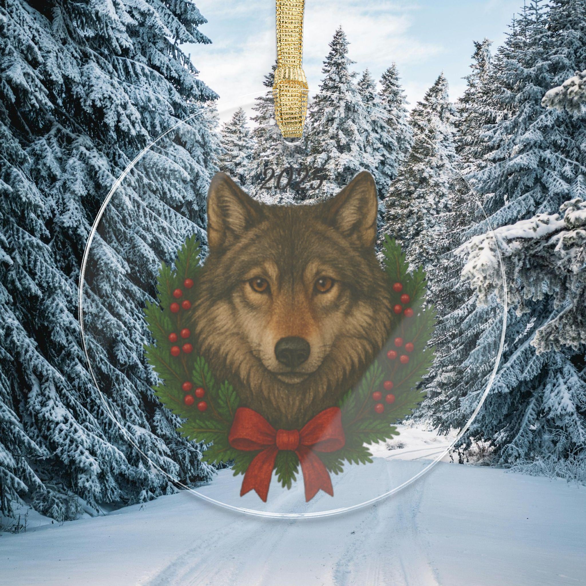 Wolf Wreath Acrylic Ornament, Christmas Tree Decor, Holiday Gift, Rustic Home Decor, Winter Wonderland Decoration