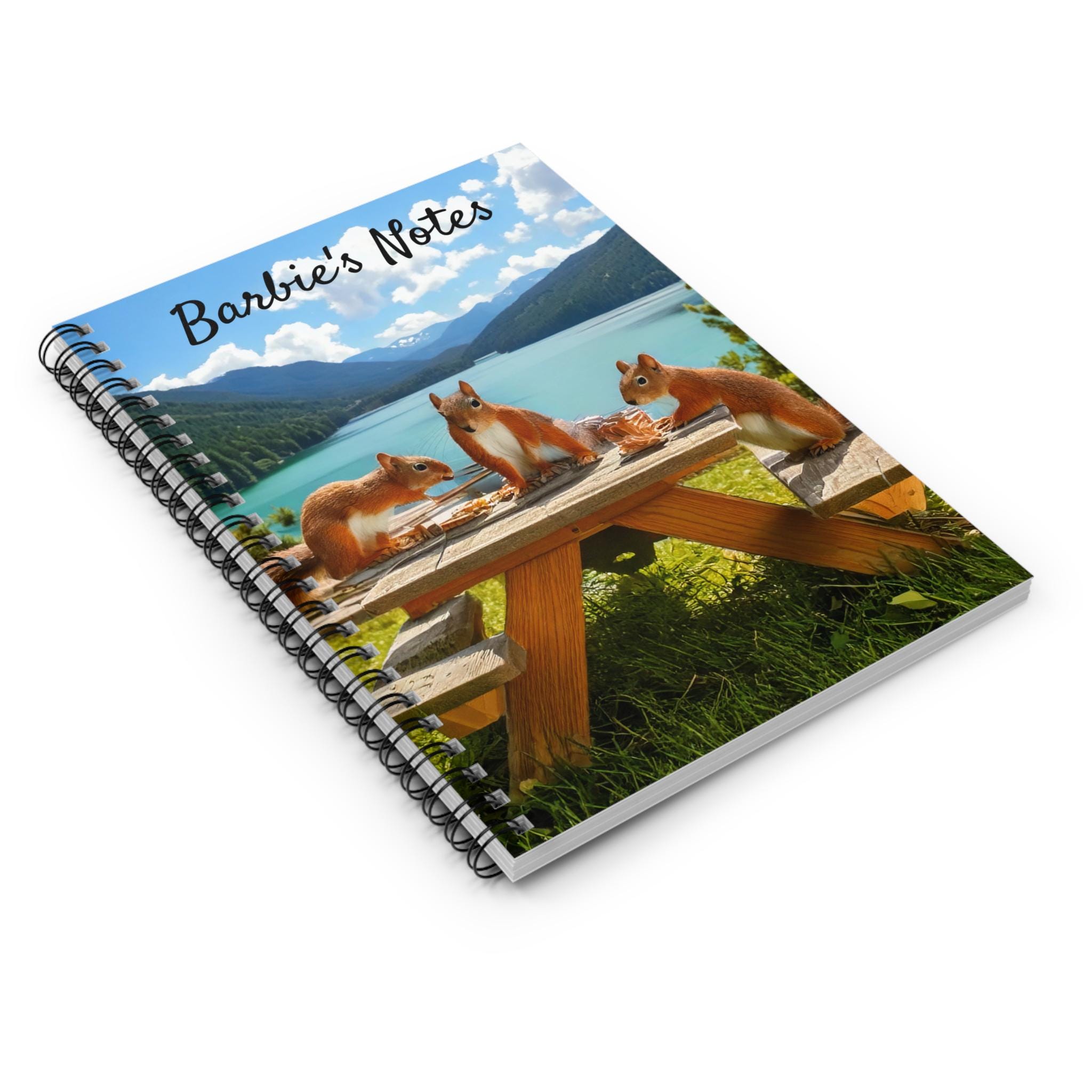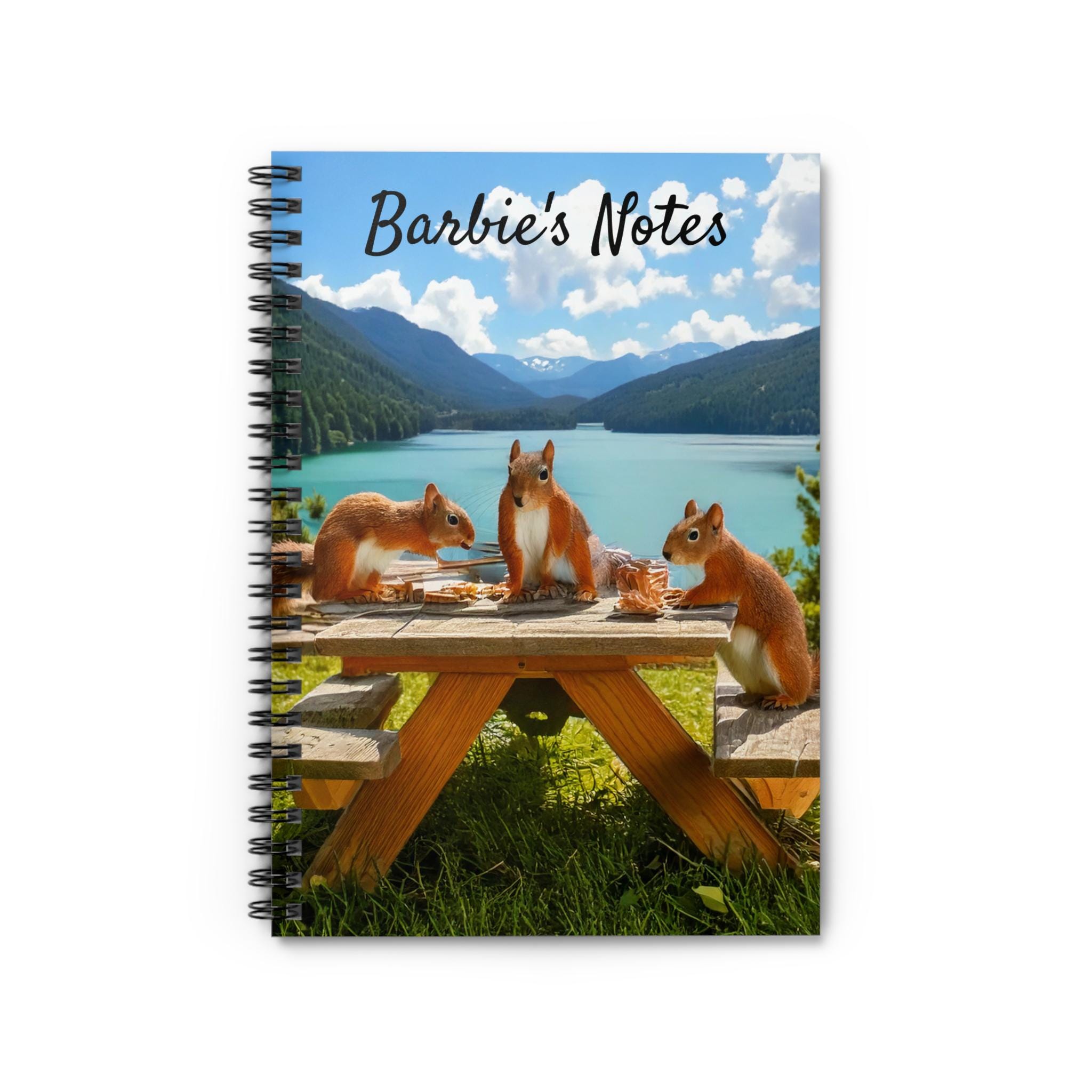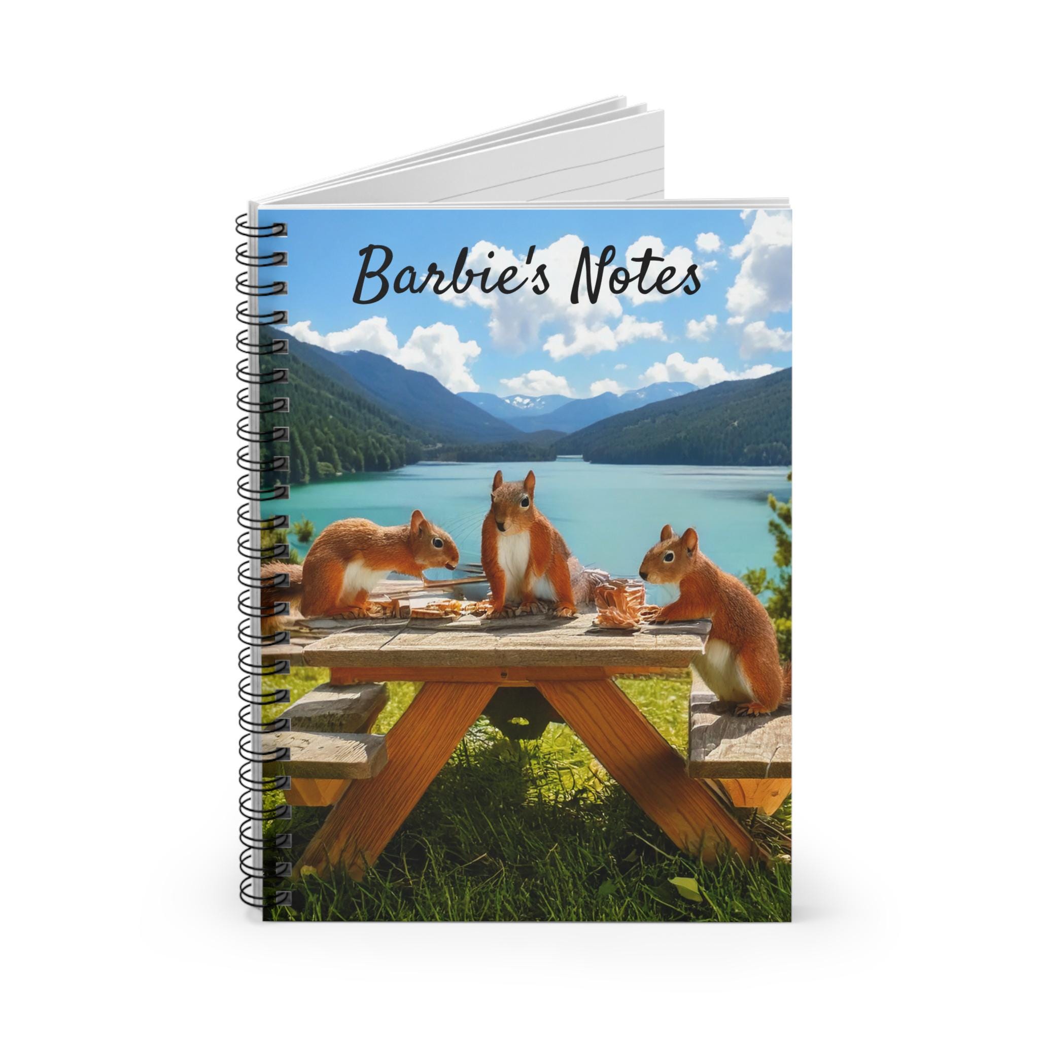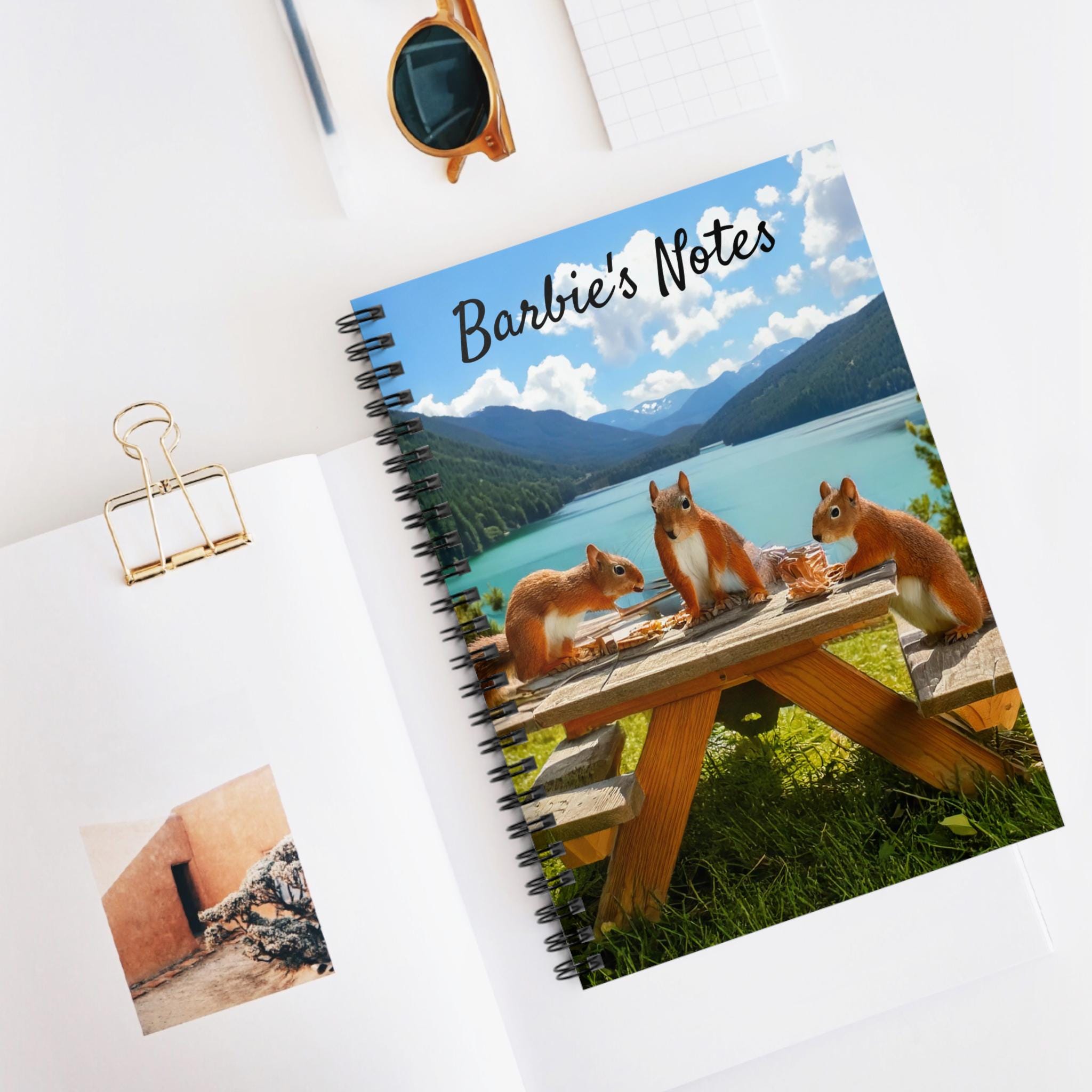 A small spiral notebook that feels like a quiet afternoon in the park. Little squirrels clustered on a picnic table on the front cover invite slow, thoughtful writing — quick lists, study notes, or pages of memory-keeping. The ruled pages are smooth and guided, the inner document pocket keeps loose tickets or clippings safe, and the metal spiral lets the notebook lie flat while you write. Its compact 6" x 8" size slips into a backpack or tote for school days, nature walks, or coffee-shop journaling. The dark grey back cover and sturdy 350 gsm covers protect your words, while the playful cover art nods to people who notice the small, lively things in the outdoors.