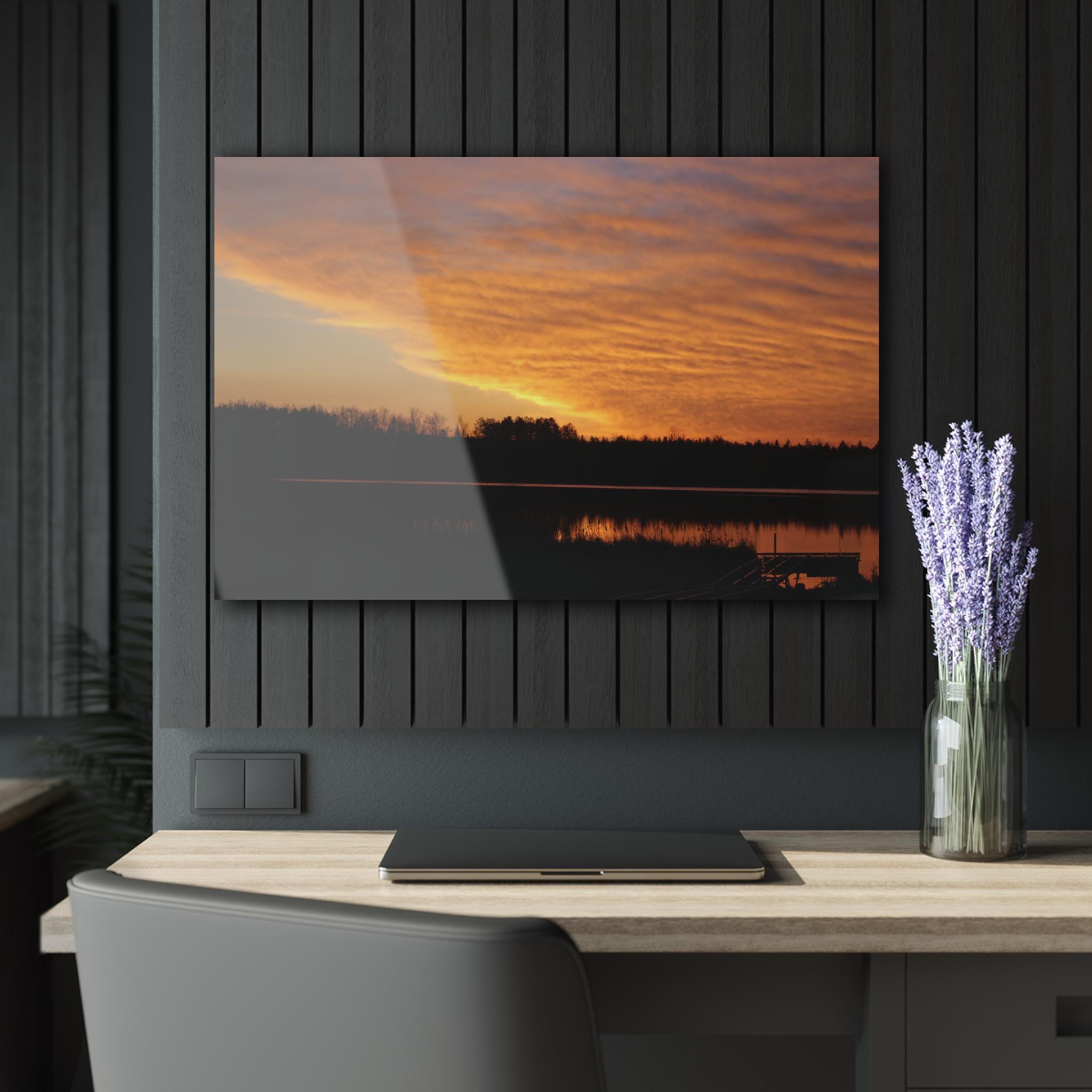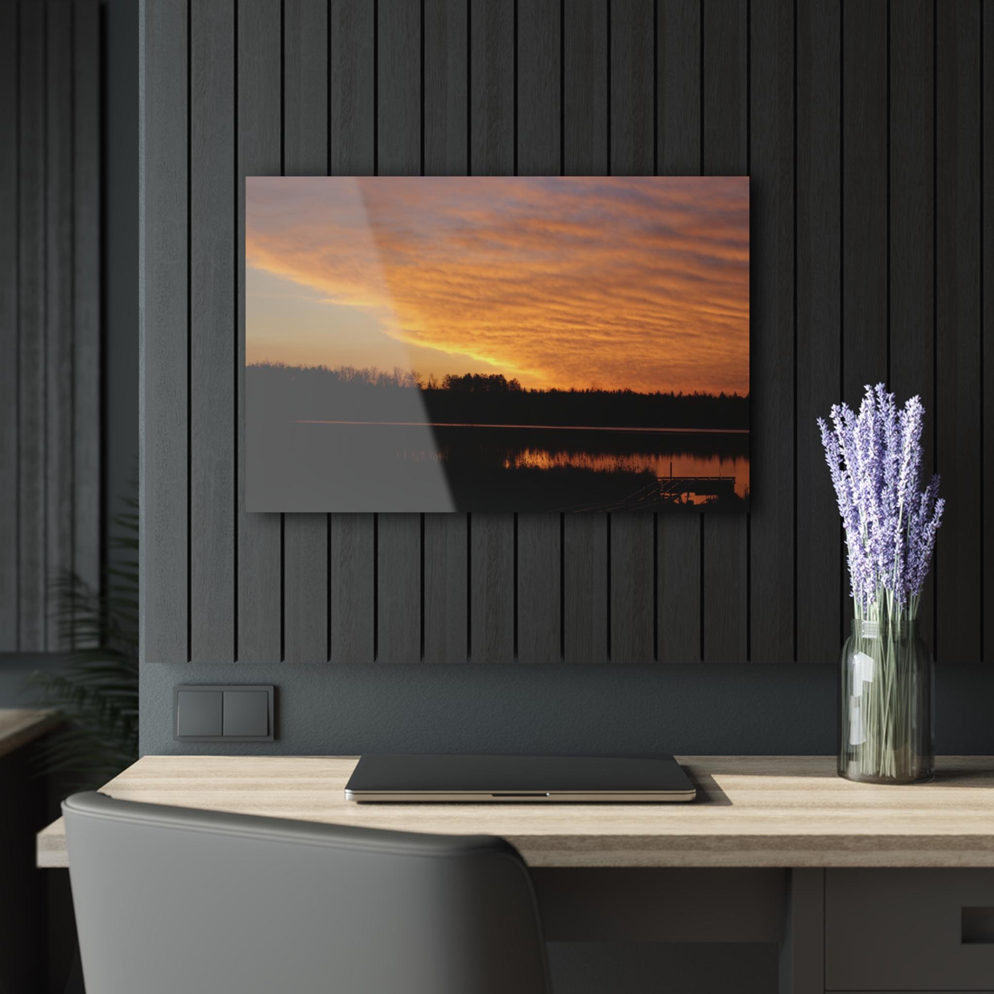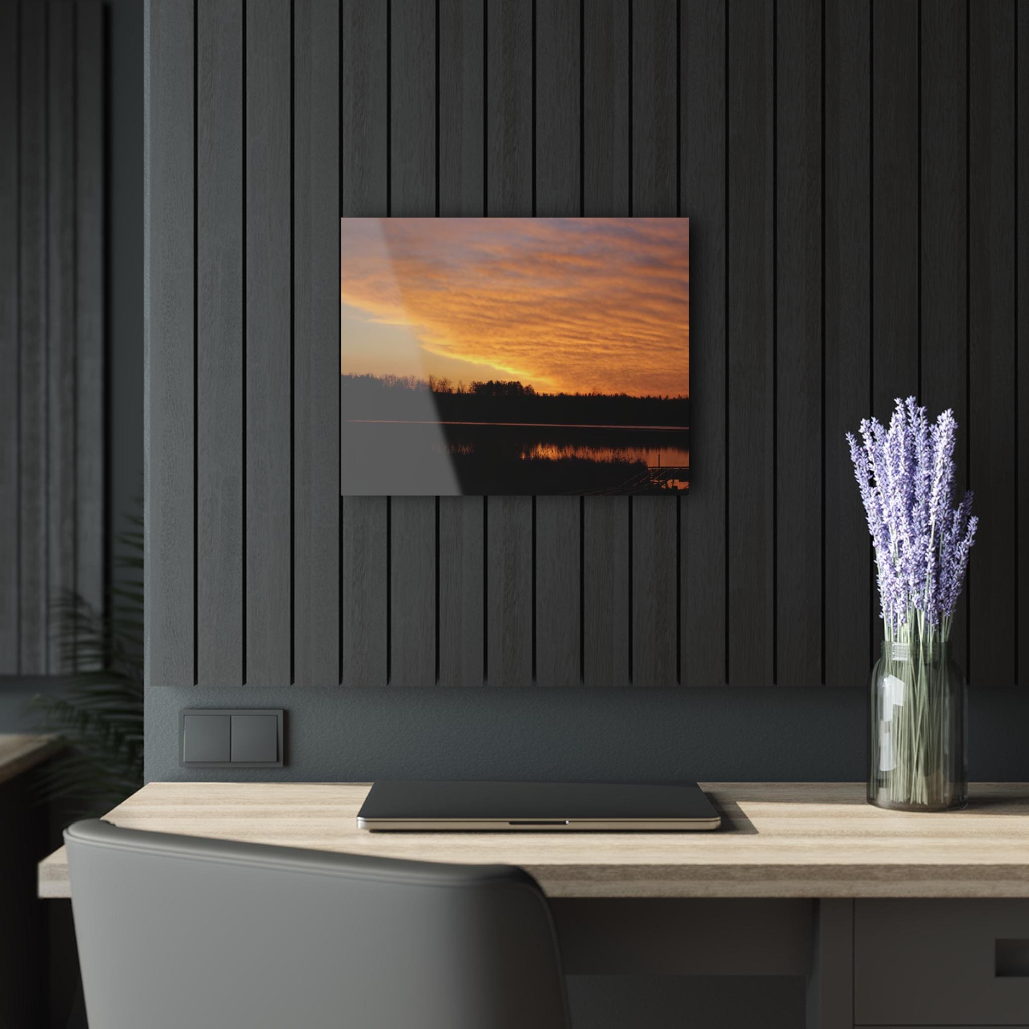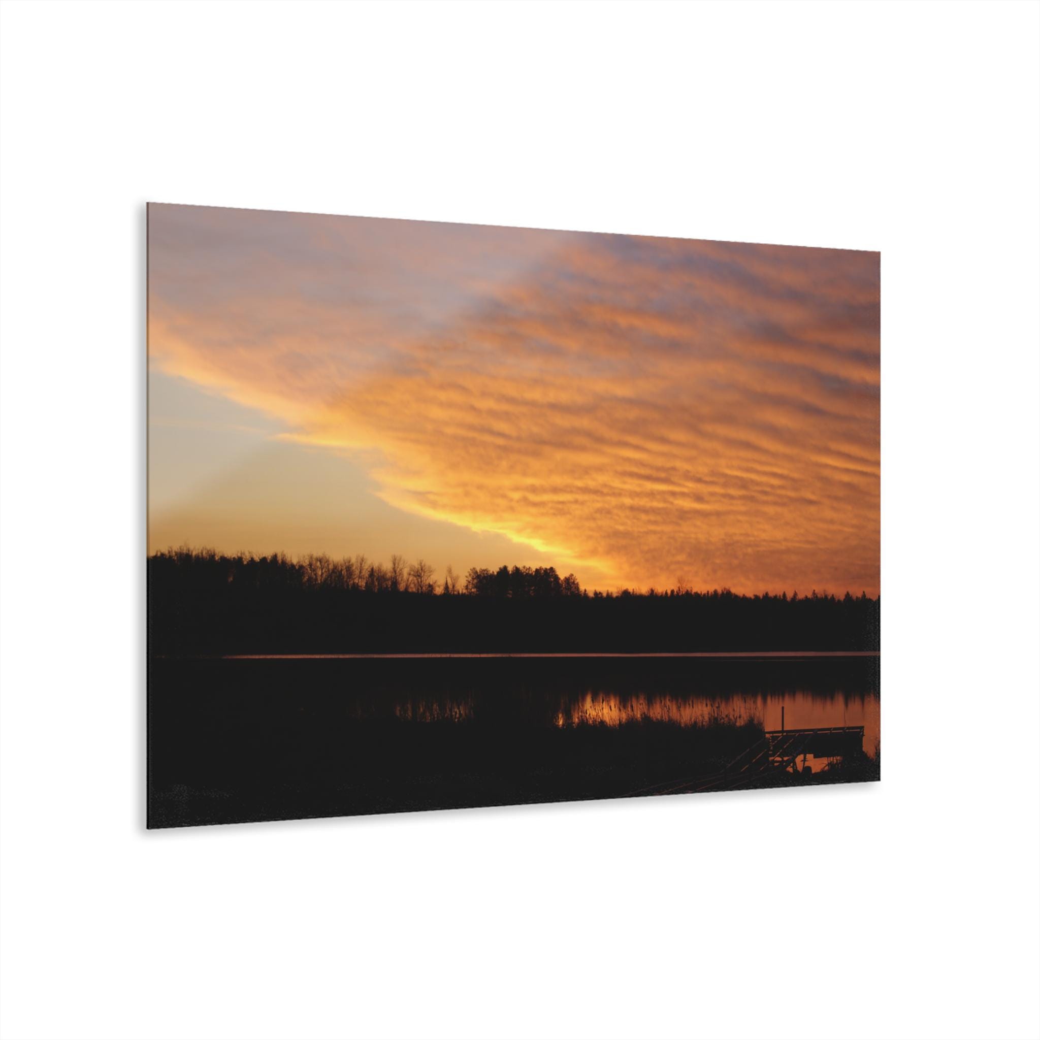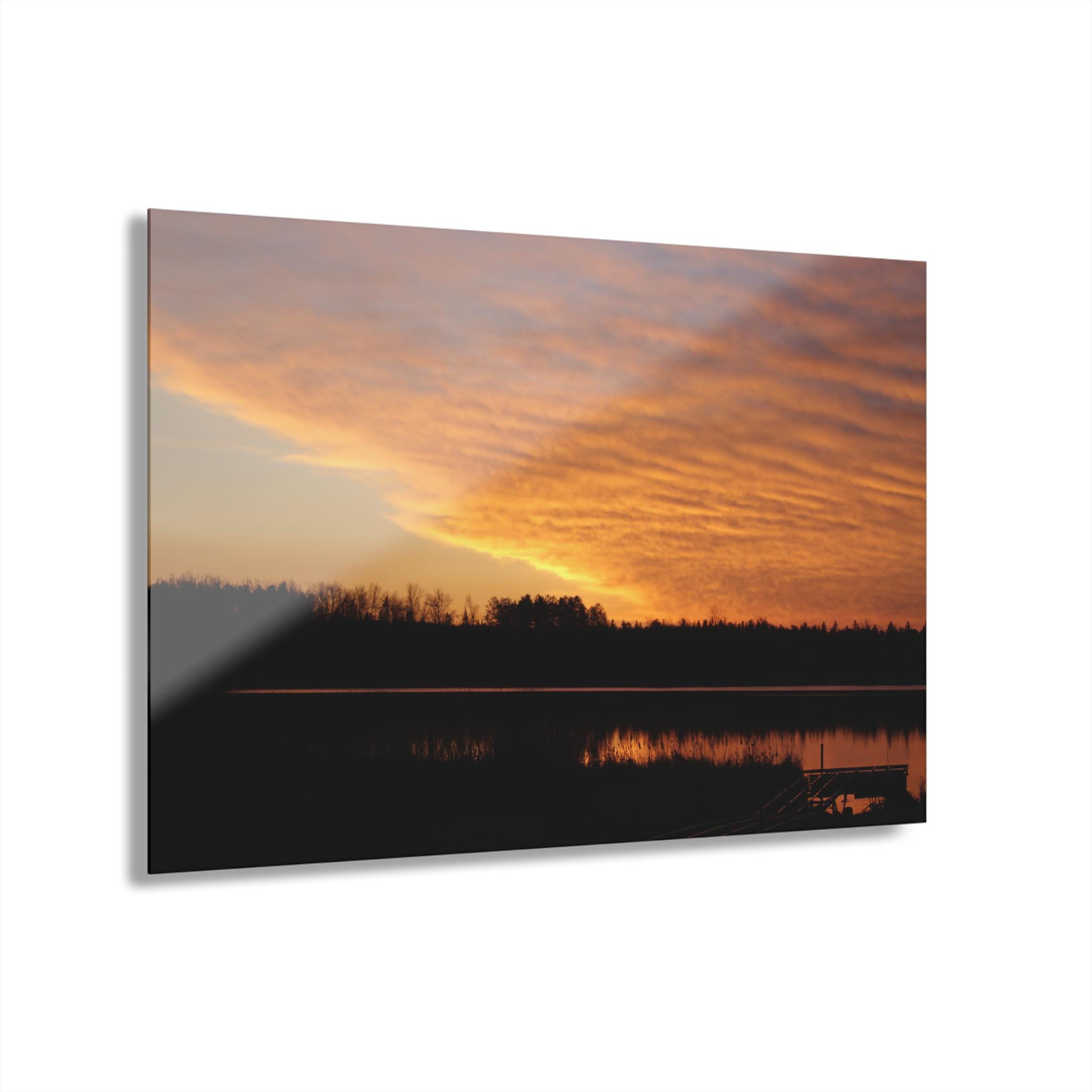 Sunset lake reflection acrylic wall art with vibrant orange sky Golden hour landscape print with glossy acrylic surface Lake house wall decor featuring sunset sky and treeline silhouette Acrylic panel art with deep colors and mirror lake reflection Modern home decor acrylic print of sunset landscape Nature photography acrylic artwork for cabins or lake homes Warm orange sunset wall art with glossy finish Vibrant acrylic landscape print mounted on wall Sunset and lake reflection nature scene art on acrylic Wildlife By Richard USA sunset landscape acrylic print
