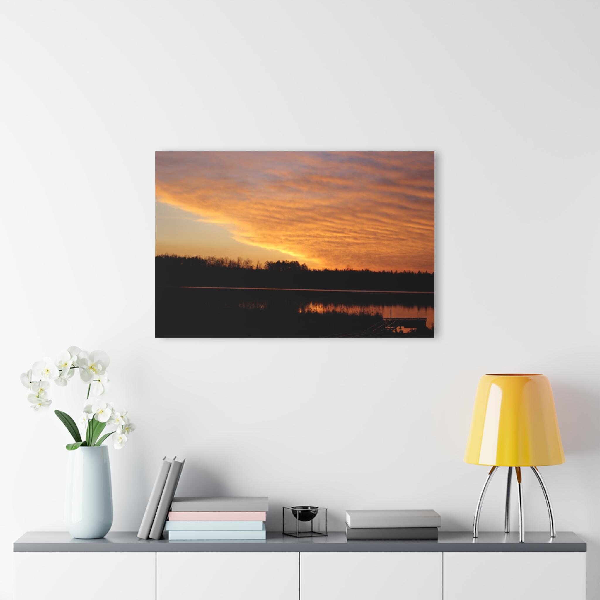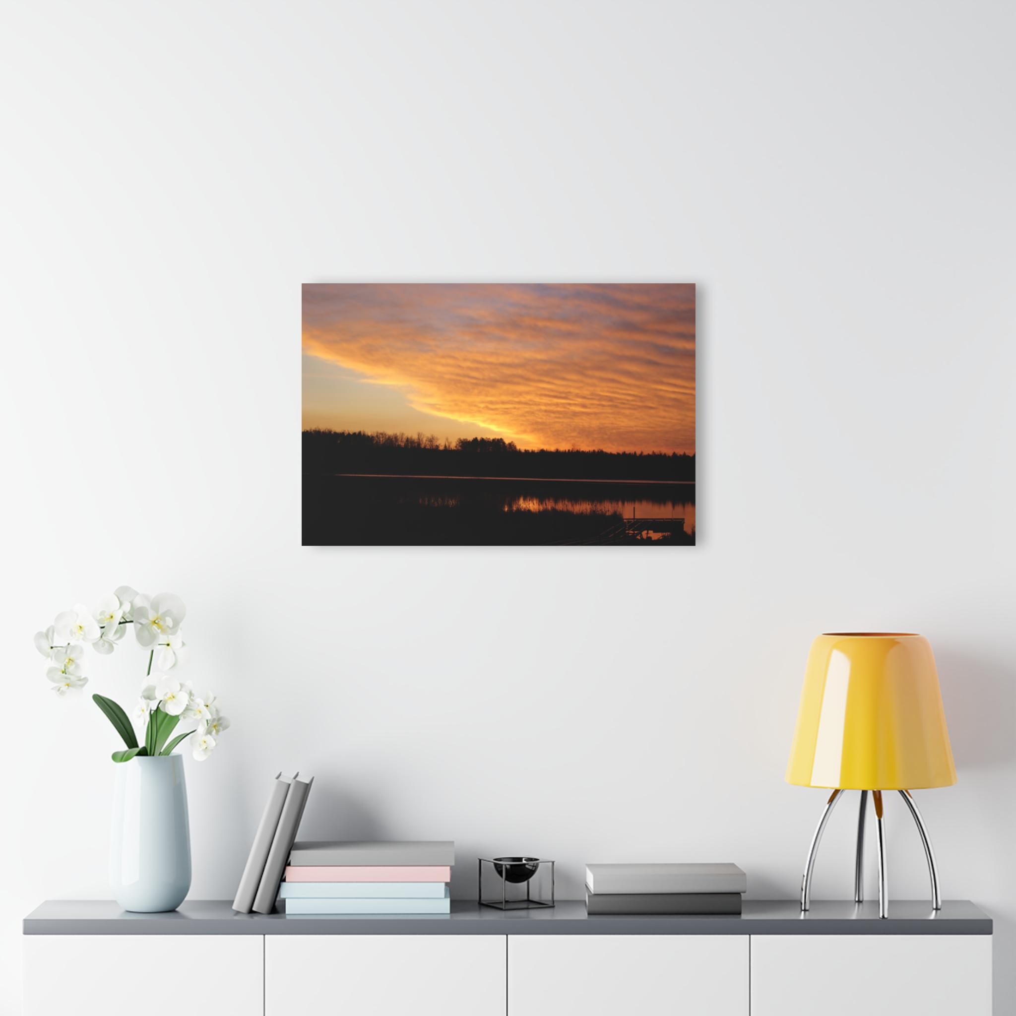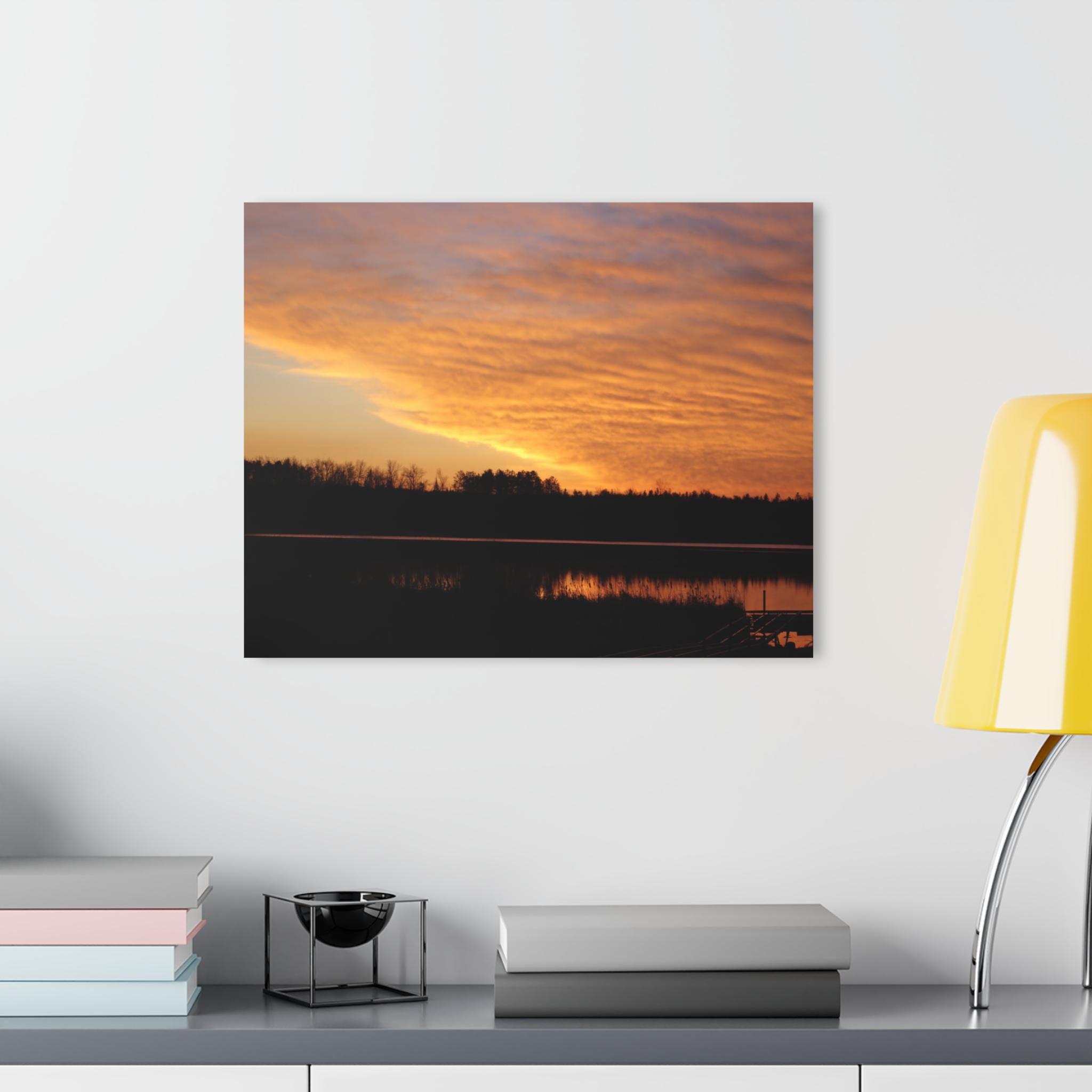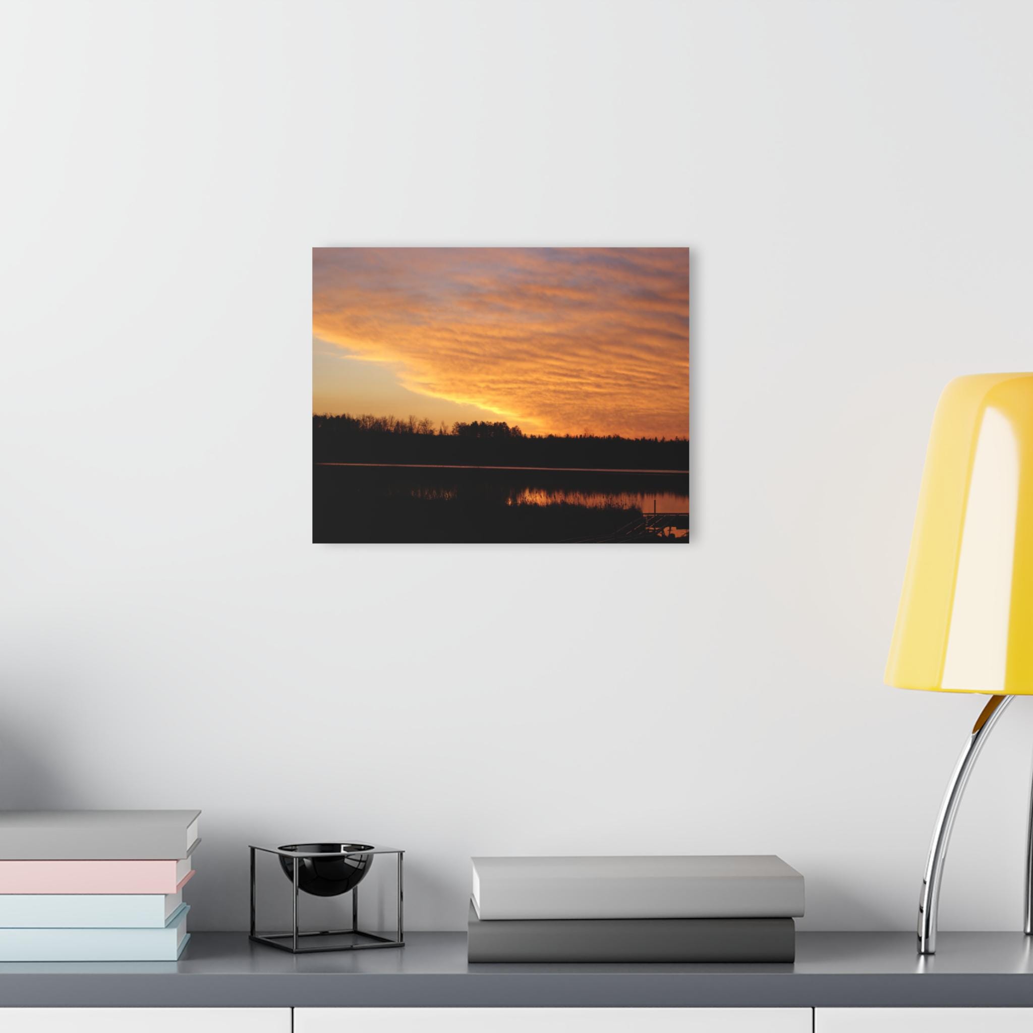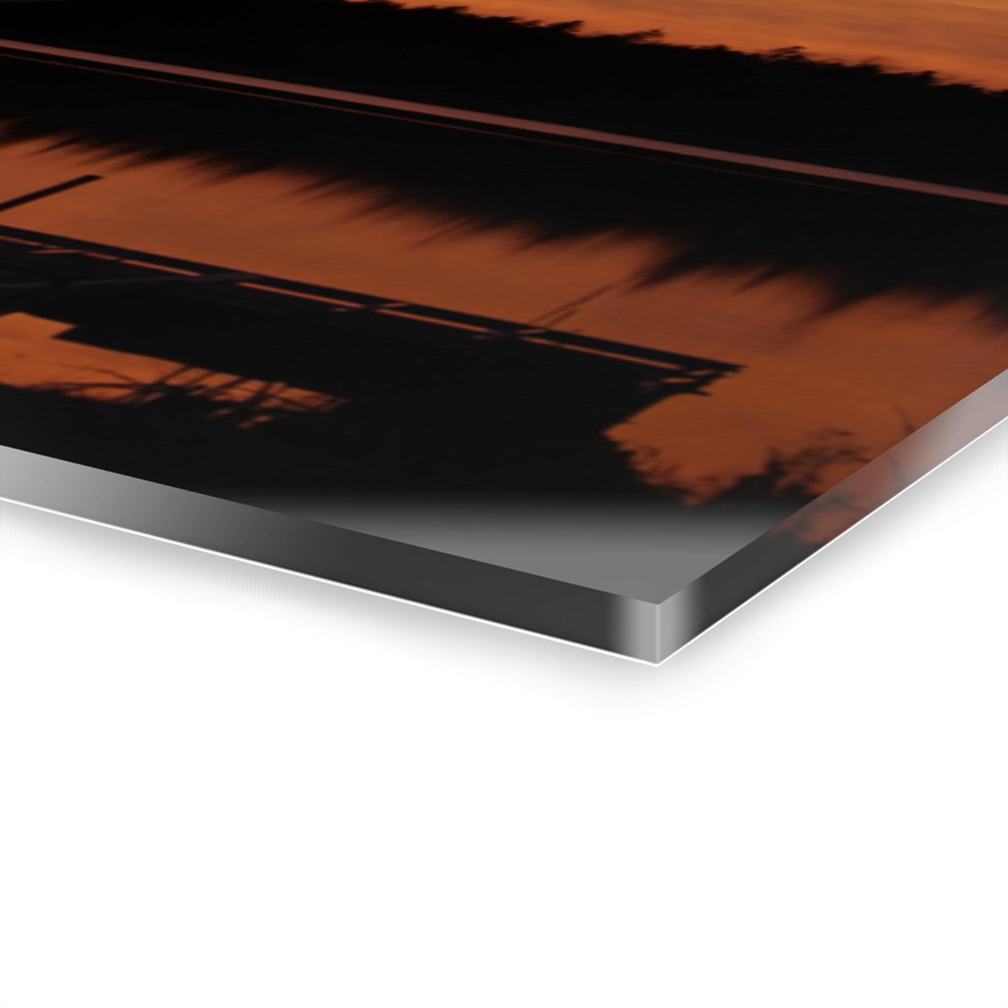Sunset lake reflection acrylic wall art with vibrant orange sky Golden hour landscape print with glossy acrylic surface Lake house wall decor featuring sunset sky and treeline silhouette Acrylic panel art with deep colors and mirror lake reflection Modern home decor acrylic print of sunset landscape Nature photography acrylic artwork for cabins or lake homes Warm orange sunset wall art with glossy finish Vibrant acrylic landscape print mounted on wall Sunset and lake reflection nature scene art on acrylic Wildlife By Richard USA sunset landscape acrylic print