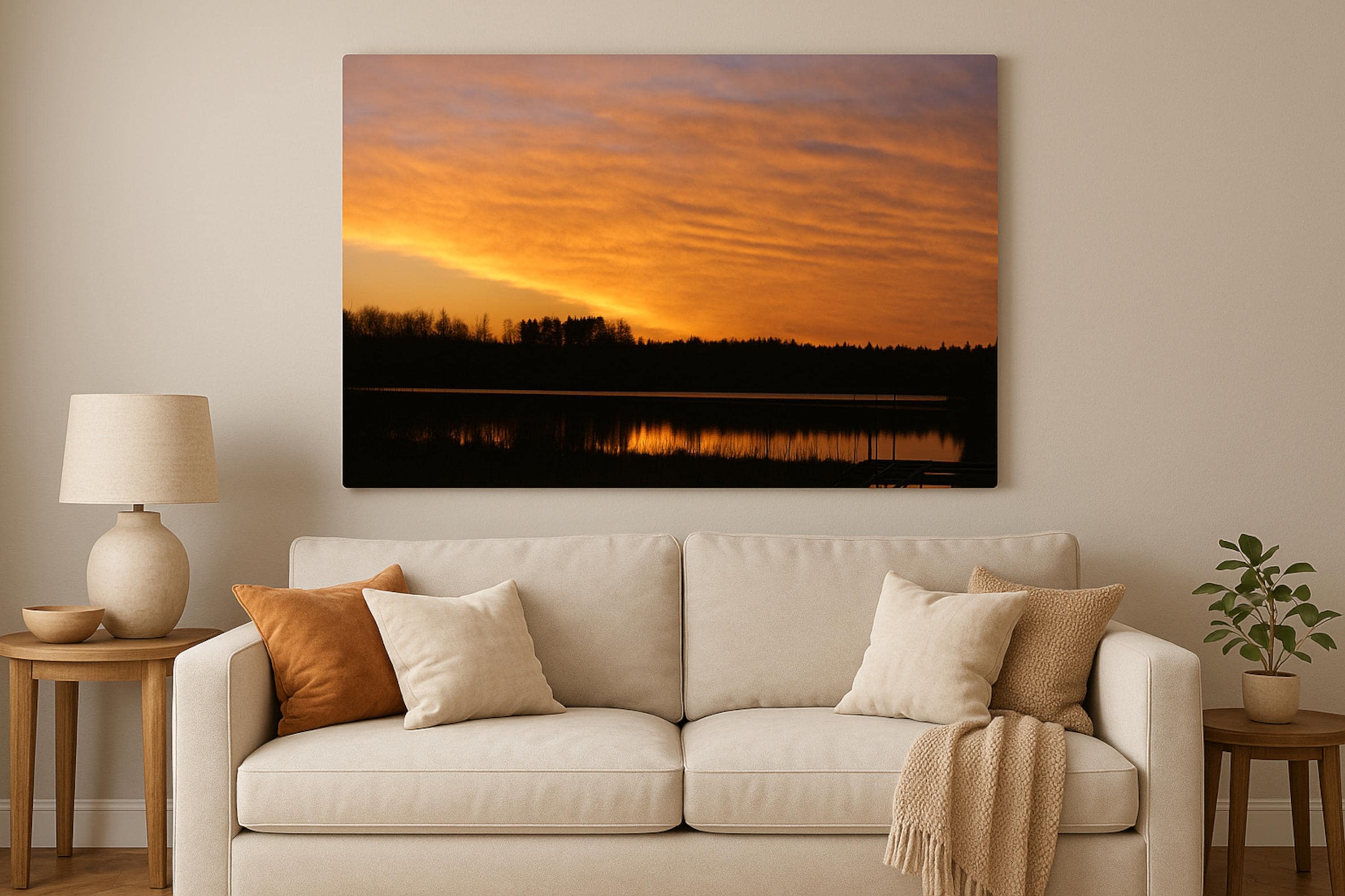 Bring the serenity of golden hour into your home with this Sunset Lake Reflection Acrylic Print. The warm orange sky, soft cloud textures, and stunning mirror-like lake reflection create a peaceful and elegant art piece perfect for bedrooms, living rooms, offices, cabins, and lake houses.